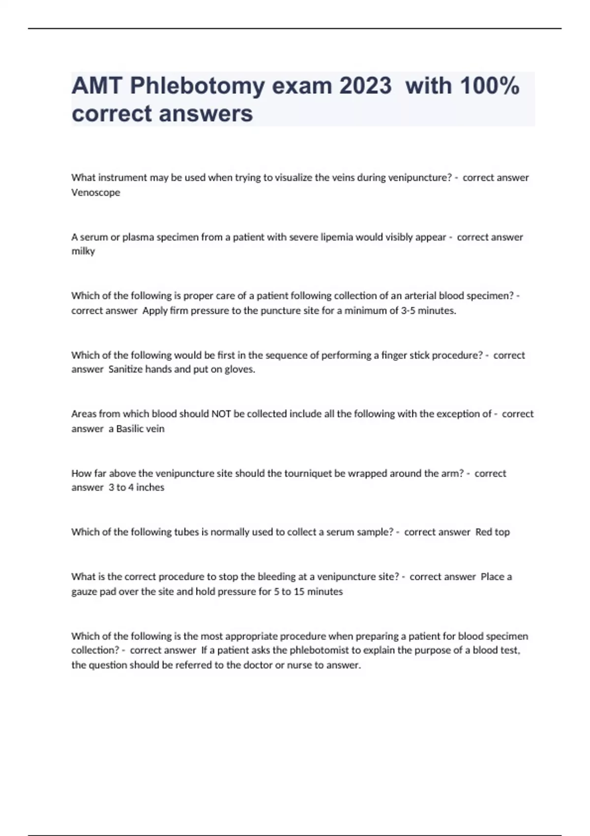 AMT Phlebotomy exam 2023 with 100% correct answers