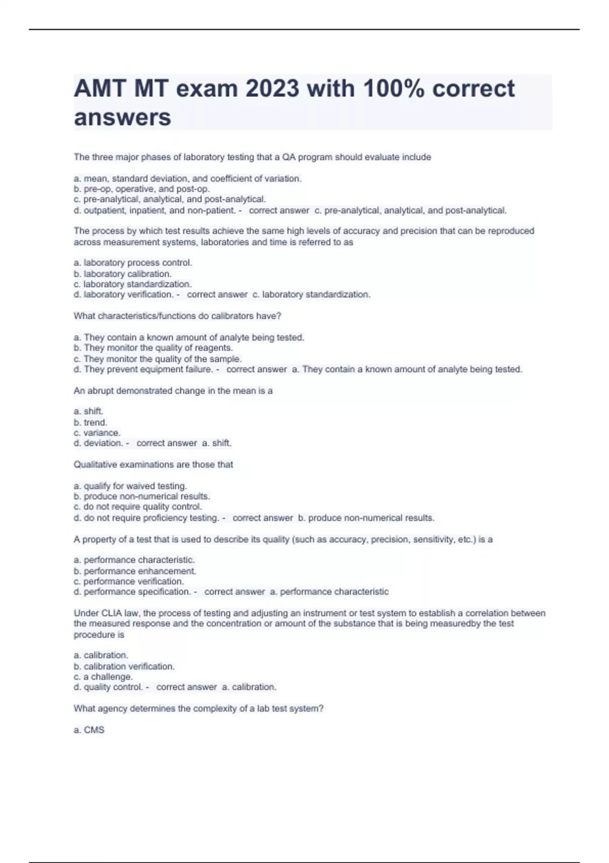 The three major phases of laboratory testing that a QA program should evaluate include a. mean, standard deviation, and coefficient of variation. b. pre-op, operative, and post-op. c. pre-analytical, analytical, and post-analytical. d. outpatient, inpatient, and non-patient. - correct answer c. pre-analytical, analytical, and post-analytical. The process by which test results achieve the same high levels of accuracy and precision that can be reproduced across measurement systems, laboratories and time is referred to as a. laboratory process control. b. laboratory calibration. c. laboratory standardization. d. laboratory verification. - correct answer c. laboratory standardization. What characteristics/functions do calibrators have? a. They contain a known amount of analyte being tested. b. They monitor the quality of reagents. c. They monitor the quality of the sample. d. They prevent equipment failure. - correct answer a. They contain a known amount of analyte being tested. An abrupt demonstrated change in the mean is a a. shift. b. trend. c. variance. d. deviation. - correct answer a. shift. Qualitative examinations are those that a. qualify for waived testing. b. produce non-numerical results. c. do not require quality control. d. do not require proficiency testing. - correct answer b. produce non-numerical results. A property of a test that is used to describe its quality (such as accuracy, precision, sensitivity, etc.) is a a. performance characteristic. b. performance enhancement. c. performance verification. d. performance specification. - correct answer a. performance characteristic Under CLIA law, the process of testing and adjusting an instrument or test system to establish a correlation between the measured response and the concentration or amount of the substance that is being measuredby the test procedure is a. calibration. b. calibration verification. c. a challenge. d. quality control. - correct answer a. calibration. What agency determines the complexity of a lab test system? a. CMS b. FDA c. CDC