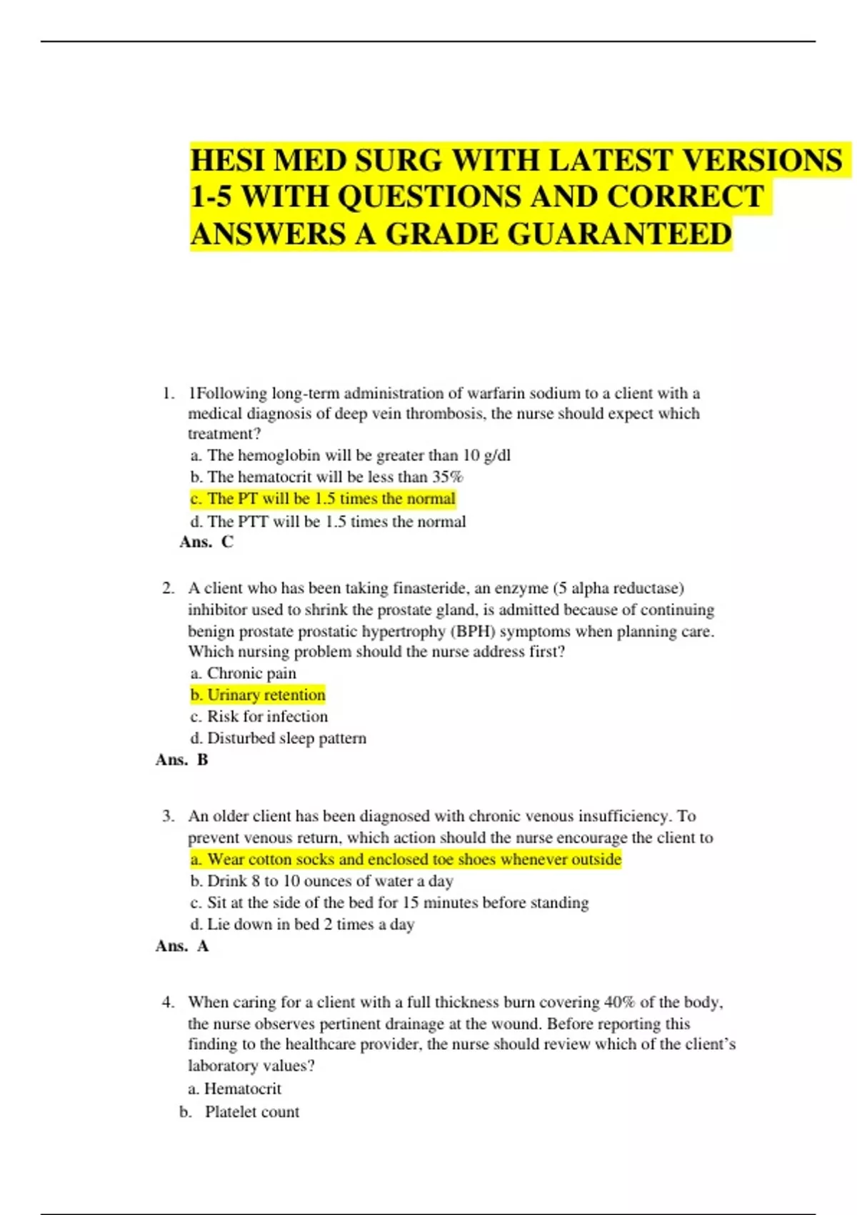 HESI MED SURG WITH LATEST VERSIONS 1-5 WITH QUESTIONS AND CORRECT ANSWERS A GRADE GUARANTEED 1. 1Following long-term administration of warfarin sodium to a client with a medical diagnosis of deep vein thrombosis, the nurse should expect which treatment? a. The hemoglobin will be greater than 10 g/dl b. The hematocrit will be less than 35% c. The PT will be 1.5 times the normal d. The PTT will be 1.5 times the normal Ans. C 2. A client who has been taking finasteride, an enzyme (5 alpha reductase) inhibitor used to shrink the prostate gland, is admitted because of continuing benign prostate prostatic hypertrophy (BPH) symptoms when planning care. Which nursing problem should the nurse address first? a. Chronic pain b. Urinary retention c. Risk for infection d. Disturbed sleep pattern Ans. B 3. An older client has been diagnosed with chronic venous insufficiency. To prevent venous return, which action should the nurse encourage the client to a. Wear cotton socks and enclosed toe shoes whenever outside b. Drink 8 to 10 ounces of water a day c. Sit at the side of the bed for 15 minutes before standing d. Lie down in bed 2 times a day Ans. A 4. When caring for a client with a full thickness burn covering 40% of the body, the nurse observes pertinent drainage at the wound. Before reporting this finding to the healthcare provider, the nurse should review which of the client’s laboratory values? a. Hematocrit b. Platelet count c. White blood cell (WBC) count d. Blood pH level Ans. C 5. An older client arrives at the outpatient eye surgery clinic for a right cataract extraction and implant. During the immediate postoperative period, which intervention should the nurse implement a. Provide an eye shield to be worn while sleeping b. Obtain vital signs every 2 hours during hospitalization c. Encourage deep breathing and coughing exercises d. Teach a family member to administer eye drops Ans. A 6. After several days of coughing and taking acetaminophen to treat temperatures of 101 F (38. 3 C), a client with DI is admitted to the hospital with an upper respiratory infection. Several hours after admission, the client reports having a severe headache and feeling dizzy. Which intervention should the nurse implement first? a. Reassess vital signs b. Obtain sputum for culture c. Obtain a fingerstick glucose d. Administer an antipyretic Ans. A 7. A client takes daily supplemental iron tablets for iron deficiency anemia reports feeling increasingly fatigued. Which laboratory values should the nurse review? a. Serum electrolytes b. Complete blood count c. Liver enzymes d. Platelet count Ans. B 8. The nurse is caring for a client post anesthesia care unit (PACU) who underwent a thoracotomy two hours ago. The nurse observes the following vital signs: heart rate 140 beats/ minute, respirations 26 breaths/minute, and blood pressure 140/90 mmHg. Which intervention is most important for the nurse to implement? a. Administer IV fluid bolus as prescribed by the healthcare provider b. Medicate for pain and monitor vital signs according to protocol c. Encourage the client to splint the incision with a pillow to cough and deep breathe d. Apply oxygen at 10 L via non-rebreather mask and monitor pulse oximeter Ans. B 9. A client who was involved in a motor vehicle collision is admitted with a fractured left femur which is immobilized using a fracture traction splint in preparation for an open reduction internal fraction (ORIF). The nurse