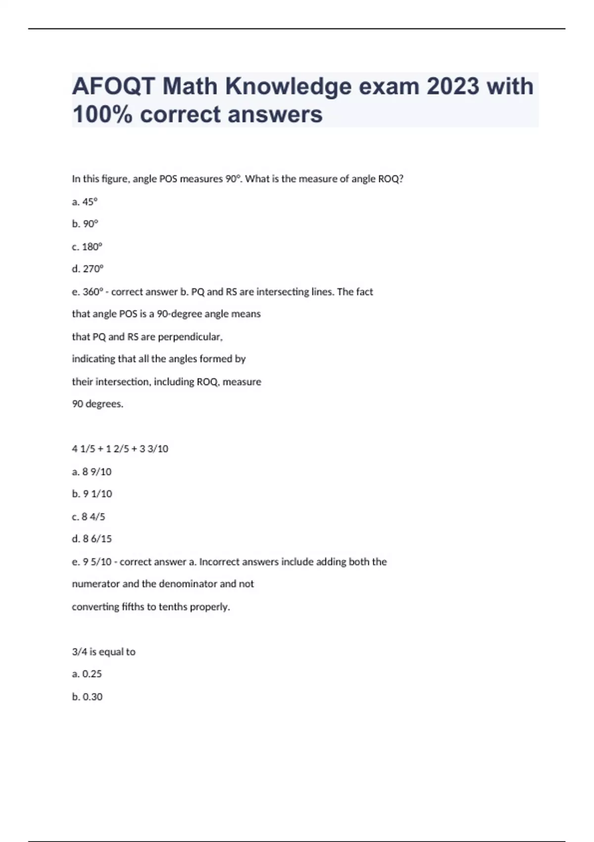 In this figure, angle POS measures 90°. What is the measure of angle ROQ? a. 45° b. 90° c. 180° d. 270° e. 360° - correct answer b. PQ and RS are intersecting lines. The fact that angle POS is a 90-degree angle means that PQ and RS are perpendicular, indicating that all the angles formed by their intersection, including ROQ, measure 90 degrees. 4 1/5 + 1 2/5 + 3 3/10 a. 8 9/10 b. 9 1/10 c. 8 4/5 d. 8 6/15 e. 9 5/10 - correct answer a. Incorrect answers include adding both the numerator and the denominator and not converting fifths to tenths properly. 3/4 is equal to a. 0.25 b. 0.30