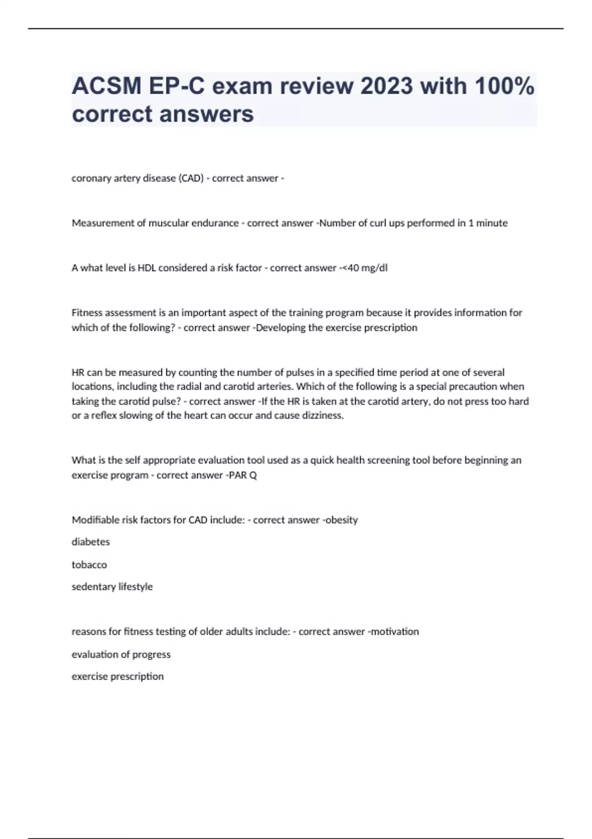 coronary artery disease (CAD) - correct answer - Measurement of muscular endurance - correct answer -Number of curl ups performed in 1 minute A what level is HDL considered a risk factor - correct answer -<40 mg/dl Fitness assessment is an important aspect of the training program because it provides information for which of the following? - correct answer -Developing the exercise prescription HR can be measured by counting the number of pulses in a specified time period at one of several locations, including the radial and carotid arteries. Which of the following is a special precaution when taking the carotid pulse? - correct answer -If the HR is taken at the carotid artery, do not press too hard or a reflex slowing of the heart can occur and cause dizziness. What is the self appropriate evaluation tool used as a quick health screening tool before beginning an exercise program - correct answer -PAR Q Modifiable risk factors for CAD include: - correct answer -obesity diabetes tobacco sedentary lifestyle reasons for fitness testing of older adults include: - correct answer -motivation evaluation of progress exercise prescription the amount of blood ejected from the heart per minute is known as - correct answer -Cardiac output