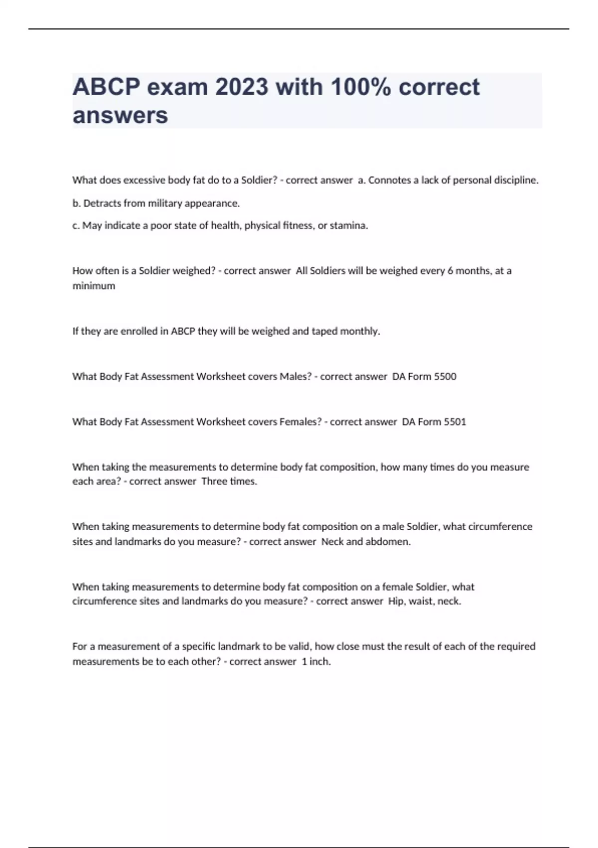 What does excessive body fat do to a Soldier? - correct answer a. Connotes a lack of personal discipline. b. Detracts from military appearance. c. May indicate a poor state of health, physical fitness, or stamina. How often is a Soldier weighed? - correct answer All Soldiers will be weighed every 6 months, at a minimum If they are enrolled in ABCP they will be weighed and taped monthly. What Body Fat Assessment Worksheet covers Males? - correct answer DA Form 5500 What Body Fat Assessment Worksheet covers Females? - correct answer DA Form 5501 When taking the measurements to determine body fat composition, how many times do you measure each are