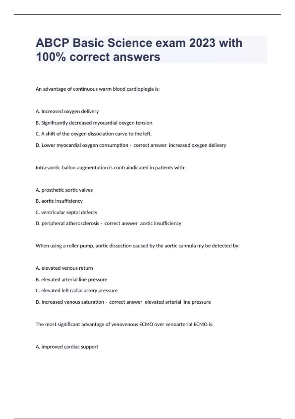 An advantage of continuous warm blood cardioplegia is: A. Increased oxygen delivery B. Significantly decreased myocardial oxygen tension. C. A shift of the oxygen dissociation curve to the left. D. Lower myocardial oxygen consumption - correct answer increased oxygen delivery Intra-aortic ballon augmentation is contraindicated in patients with: A. prosthetic aortic valves B. aortic insufficiency C. ventricular septal defects D. peripheral atherosclerosis - correct answer aortic insufficiency When using a roller pump, aortic dissection caused by the aortic cannula my be detected by: A. elevated venous return B. elevated arterial line pressure C. elevat