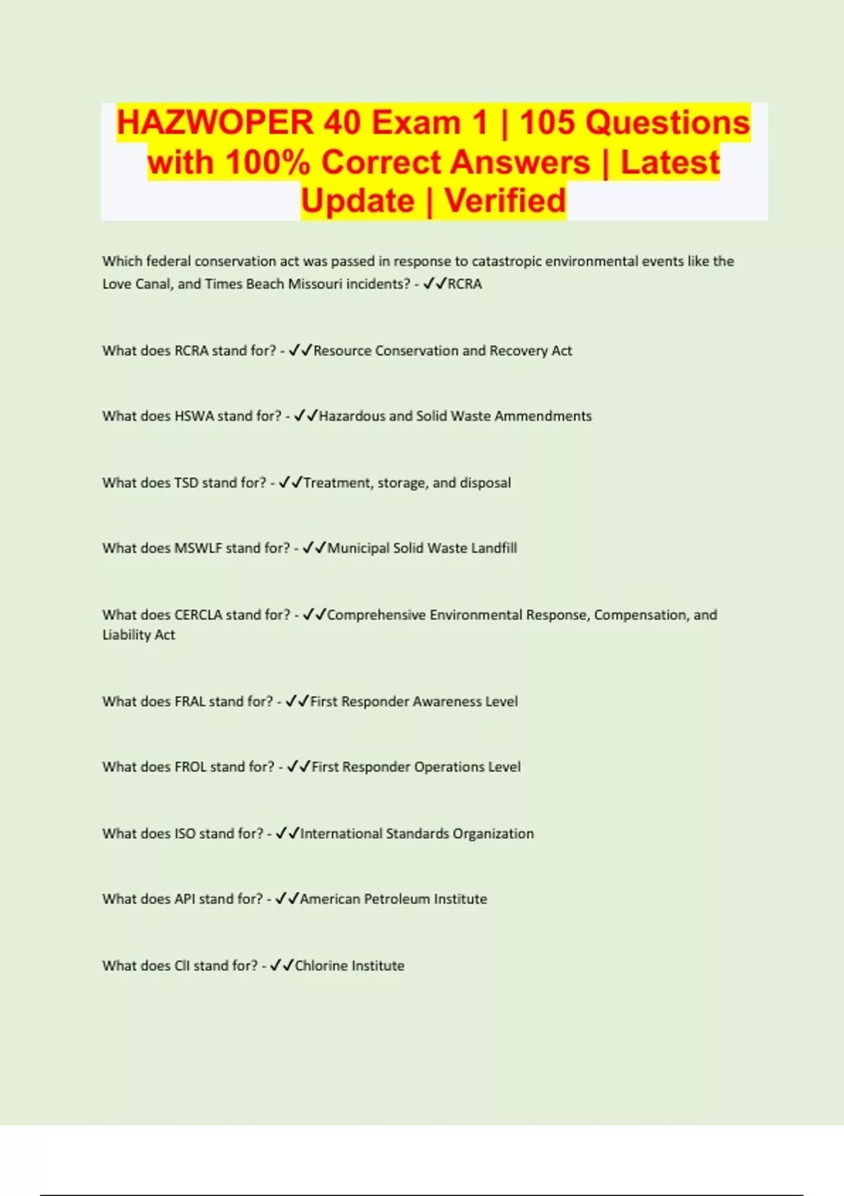 Which federal conservation act was passed in response to catastropic environmental events like the Love Canal, and Times Beach Missouri incidents? - RCRA What does RCRA stand for? - Resource Conservation and Recovery Act What does HSWA stand for? - Hazardous and Solid Waste Ammendments What does TSD stand for? - Treatment, storage, and disposal What does MSWLF stand for? - Municipal Solid Waste Landfill What does CERCLA stand for? - Comprehensive Environmental Response, Compensation, and Liability Act What does FRAL stand for? - First Responder Awareness Level What does FROL stand for? - First Responder Operations Level What does ISO stand for? - International Standards Organization What does API stand for? - American Petroleum Institute What does ClI stand for? - Chlorine Institute