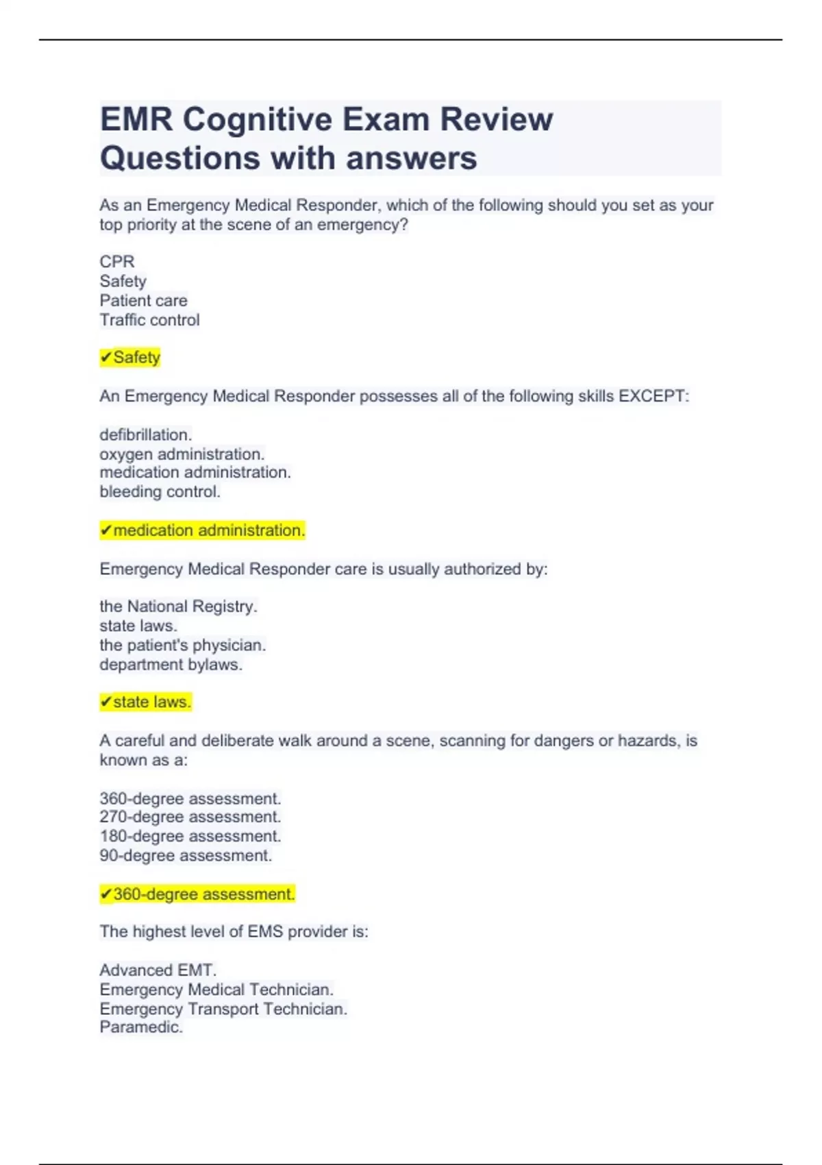 EMR Cognitive Exam Review Questions with answers