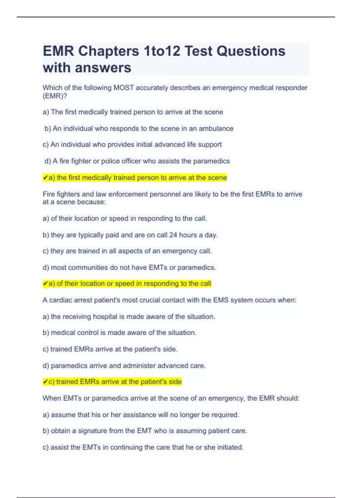 EMR Chapters 1to12 Test Questions with answers