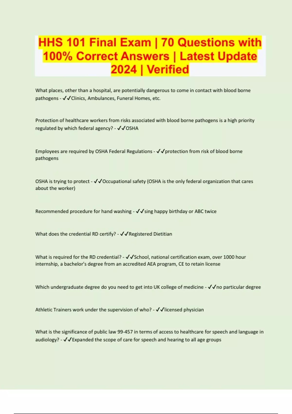 HHS 101 Final Exam | 70 Questions with 100% Correct Answers | Latest Update 2024 | Verified