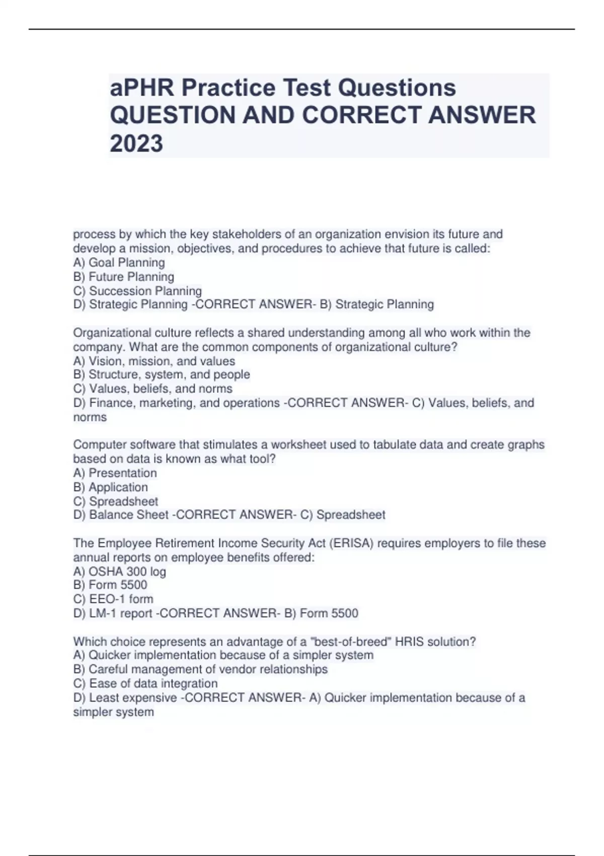 aPHR Practice Test Questions QUESTION AND CORRECT ANSWER 2023 process by which the key stakeholders of an organization envision its future and develop a mission, objectives, and procedures to achieve that future is called: A) Goal Planning B) Future Planning C) Succession Planning D) Strategic Planning -CORRECT ANSWER- B) Strategic Planning Organizational culture reflects a shared understanding among all who work within the company. What are the common components of organizational culture? A) Vision, mission, and values B) Structure, system, and people C) Values, beliefs, and norms D) Finance, marketing, and operations -CORRECT ANSWER- C) Values, beliefs, and norms Computer software that stimulates a worksheet used to tabulate data and create graphs based on data is known as what tool? A) Presentation B) Application C) Spreadsheet D) Balance Sheet -CORRECT ANSWER- C) Spreadsheet The Employee Retirement Income Security Act (ERISA) requires employers to file these annual reports on employee benefits offered: A) OSHA 300 log B) Form 5500 C) EEO-1 form D) LM-1 report -CORRECT ANSWER- B) Form 5500 Which choice represents an advantage of a "best-of-breed" HRIS solution? A) Quicker implementation because of a simpler system B) Careful management of vendor relationships C) Ease of data integration D) Least expensive -CORRECT ANSWER- A) Quicker implementation because of a simpler system Each essential job function in a job description should consider? A) Pay level associated with it B) Level of complexity and frequency C) Education needed to complete the job function D) Work experience of past incumbents in the job -CORRECT ANSWER- B) Level of complexity and frequency An HR business process outcome (BPO) is an arrangement: A) Where payroll and benefit administration are entirely outsourced B) Where employees are leased to an outsourcing company C) Where employees are staffed by external recruitment agencies D) Where benefits are outsourced only to an external provider -CORRECT ANSWERA) Where payroll and benefit administration are entirely outsourced Which of the following statements best describes the Older Worker Benefit Protection Act (OWBPA)? A) It is applicable only to public employees B) Older workers can waive ADEA rights if they are given at least 10 business days to consider their options C) It prevents hiring discrimination on the basis of age D) It is unlawful to target older workers during a reduction in force (RIF) -CORRECT ANSWER- D) It is unlawful to target older workers during a reduction in force Which of the following is an example of hiring discrimination? A) The applicant tracking system asks a person to disclose his or her race, sex, color, religion, national origin or age. B) The ATS fails to collect genetic and medical history information from individuals C) The ATS fails to process applications for those who have self-disclosed their disability D) The ATS requires individuals to take a test related to the position they are interested in -CORRECT ANSWER- C) The ATS fails to process applications for those who have self-disclosed their disability status ATS can miss out on a large talent pool today if they lack what functionality? A) Quality of hire tracking B) Ad placement tracking C) Cost per hire tracking D) Mobile Access -CORRECT ANSWER- D) Mobile Access An internal recruitment method employed by organizations to identify potential candidates from their existing employees is known as: A) Independent contractors B) Temp Agencies C) Job Posting D) Employee referral -CORRECT ANSWER- D) Employee referral Which type of interview uses past performance as a predictor of future behavior? A) Structured B) Competency based C) Behavioral D) Stress -CORRECT ANSWER- C) Behavioral Pre-offer drug testing could violate which act? A) Family Medical Leave Act B) Americans with Disabilities Act C) Age Discrimination in Employment Act D) Title VII of the Civil Rights Act -CORRECT ANSWER- B) Americans with Disabilities Act Which of the following laws states that the statute of limitations on pay discrimination lawsuits resets as each alleged discriminatory paycheck is issued? A) Lily Ledbetter Fair Pay Act B) Equal Pay Act C) Davis-Bacon Act D) Copeland "Anti-Kickback" Act -CORRECT ANSWER- A) Lily Ledbetter Fair Pay Act Which of the following identifies a pay adjustment that is given to all employees regardless of employee performance or the organizations financial health? A) Differential pay B) Market-based increase C) Cost of living adjustment D) Lump sum increase -CORRECT ANSWER- C) Cost of living adjustment A bank of hours in which the employer provides time that employees use for sick, vacation, and holidays is known as: A) Vacation time off B) Personal time off C) Sick time off D) Paid time off -CORRECT ANSWER- D) Paid time off If an organization chooses to focus on the 75th percentile of the market, what type of pay philosophy has it adopted? A) Market leader B) Lag-leader C) Matching market D) Market lag -CORRECT ANSWER- A) Market leader Which of the following is an example of a compressed work week? A) Working from home B) Sharing job responsibilities with another colleague C) Working four 10-hour days D) Working 20 hours a week -CORRECT ANSWER- C) Working four 10-hour days Which of the following data gathering methods would help the HR manager determine whether employee behavior has changed after training? A) Checklist B) 360-degree feedback C) Post-measure test D) ROI analysis -CORRECT ANSWER- B) 360-degree feedback A company reaches an agreement with a labor union that states only union members will be employed with the company. Which of the following laws makes it illegal to establish a closed shop except in the construction industry? A) National Labor Relations Act B) Wagner Act C) Taft-Hartley Act D) Labor-Management Reporting and Disclosure Act -CORRECT ANSWER- C) TaftHartley Act Which of the following describes an employment-at-will exception? A) Employee terminated after fili