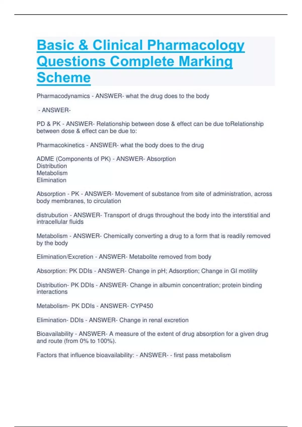 Basic & Clinical Pharmacology Questions Complete Marking Scheme Pharmacodynamics - ANSWER- what the drug does to the body - ANSWERPD & PK - ANSWER- Relationship between dose & effect can be due toRelationship between dose & effect can be due to: Pharmacokinetics - ANSWER- what the body does to the drug ADME (Components of PK) - ANSWER- Absorption Distribution Metabolism Elimination Absorption - PK - ANSWER- Movement of substance from site of administration, across body membranes, to circulation distrubution - ANSWER- Transport of drugs throughout the body into the interstitial and intracellular fluids Metabolism - ANSWER- Chemically converting a drug to a form that is readily removed by the body Elimination/Excretion - ANSWER- Metabolite removed from body Absorption: PK DDIs - ANSWER- Change in pH; Adsorption; Change in GI motility Distribution- PK DDIs - ANSWER- Change in albumin concentration; protein binding interactions Metabolism- PK DDIs - ANSWER- CYP450 Elimination- DDIs - ANSWER- Change in renal excretion Bioavailability - ANSWER- A measure of the extent of drug absorption for a given drug and route (from 0% to 100%). Factors that influence bioavailability: - ANSWER- - first pass metabolism - solubility of drug - chemical instability - drug formulation First Pass Effect - ANSWER- a phenomenon in which drugs given orally are carried directly to the liver after absorption, where they may be largely inactivated by liver enzymes before they can enter the general circulation; oral drugs frequently are given in higher doses than drugs given by other routes because of this early breakdown Bioequivalence drugs: - ANSWER- Share similar rate and extent of absorption Therapeutic Equivalence - ANSWER- Similar drugs in efficacy and safety active transport - ANSWER- Movement of chemical against a concentration or electrochemical gradient; Requires ENERGY from the cell passive diffusion - ANSWER- movement of chemical from area of high concentration to low concentration (HIGH TO LOW); Occurs passively- cell allows it to just happen Endocytosis - ANSWER- Engulfment of drug molecule by cell membrane and transport into the cell; Transports large molecules Factors of drug absorption - ANSWER- - molecular weight & size - dose - route of admin - digestive motility - blood flow - lipid solubility - degree of ionization - partition coefficient Factors influencing GI absorption - ANSWER- - Blood flow - pH - Intestinal Surface area (microvilli) - Contact time with absorptive surface Most drugs are absorbed from: - ANSWER- Lower GI tract Increased peristalsis - ANSWER- = increased drug transit time & DECREASED time for absorption Decreased peristalsis - ANSWER- = decreased transit time & INCREASED time for absorption Distribution of drug delivery - ANSWER- Process in which a drug reversibly leaves blood stream and enters interstitum and/or cells Drug delivery is dependent on: - ANSWER- - Affinity - Blood Flow - Capillary permeability - Drug-protein complexes/competence - Drug Structure - Drug/Food interactions - Hydrophobicity capillary permeability - ANSWER- condition of the capillary wall that enables substances in the blood to pass into tissue spaces or into cells, or visa versa; absent in the brain "Blood-Brain Barrier" Drug Structure - ANSWER- Chemical nature of the drug largely determines ability to cross cell membranes Hydrophobic Drugs - ANSWER- Lipid (fat) soluble drugs that penetrate the lipoidal (fatlike) cell membrane better than hydrophilic drugs. Hydrophilic drugs - ANSWER- Do not easily pass through cell membranes; need slit junctions for passage; "LIKE WATER" Blood Brain Barrier (BBB) - ANSWER- Drugs must pass through endothelial cells of the CNS capillaries or be actively transported; Lipid- soluble drugs are able to penetrate; Ionized or polar drugs cannot pass without slit junction