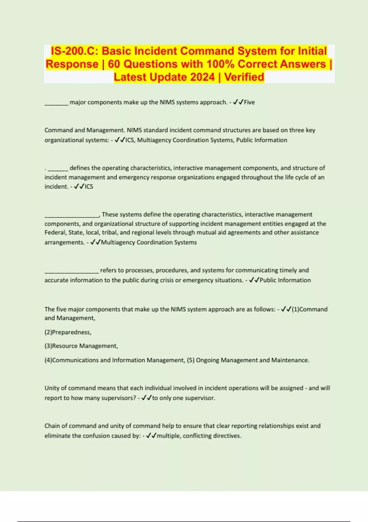 IS-200.C: Basic Incident Command System for Initial Response | 60 Questions with 100% Correct Answers | Latest Update 2024 | Verifie