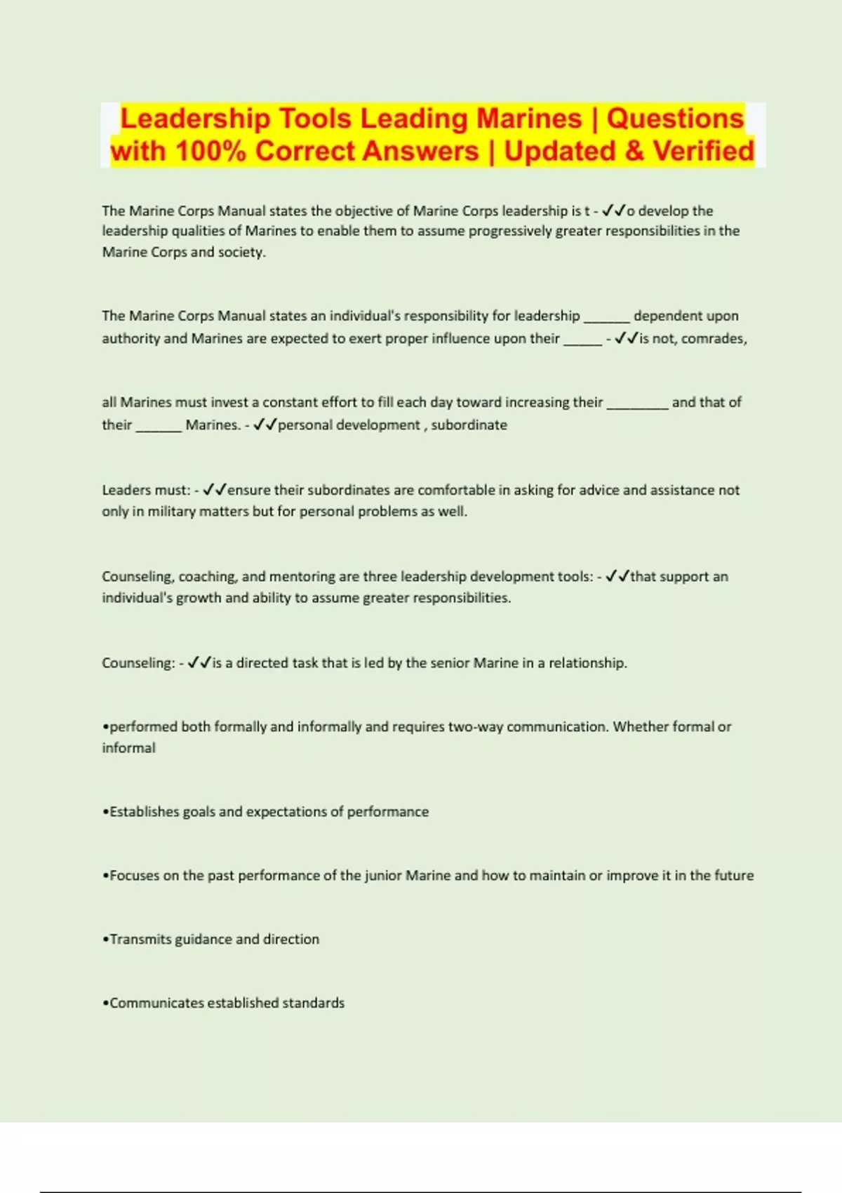 Leadership Tools Leading Marines | Questions with 100% Correct Answers | Updated & Verified