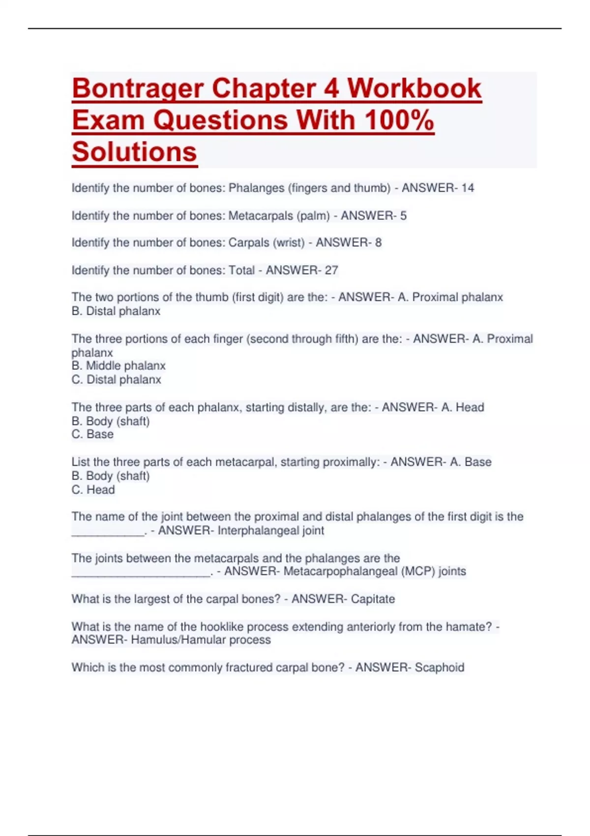 Bontrager Chapter 4 Workbook Exam Questions With 100% Solutions Identify the number of bones: Phalanges (fingers and thumb) - ANSWER- 14 Identify the number of bones: Metacarpals (palm) - ANSWER- 5 Identify the number of bones: Carpals (wrist) - ANSWER- 8 Identify the number of bones: Total - ANSWER- 27 The two portions of the thumb (first digit) are the: - ANSWER- A. Proximal phalanx B. Distal phalanx The three portions of each finger (second through fifth) are the: - ANSWER- A. Proximal phalanx B. Middle phalanx C. Distal phalanx The three parts of each phalanx, starting distally, are the: - ANSWER- A. Head B. Body (shaft) C. Base List the three parts of each metacarpal, starting proximally: - ANSWER- A. Base B. Body (shaft) C. Head The name of the joint between the proximal and distal phalanges of the first digit is the ___________. - ANSWER- Interphalangeal joint The joints between the metacarpals and the phalanges are the _____________________. - ANSWER- Metacarpophalangeal (MCP) joints What is the largest of the carpal bones? - ANSWER- Capitate What is the name of the hooklike process extending anteriorly from the hamate? - ANSWER- Hamulus/Hamular process Which is the most commonly fractured carpal bone? - ANSWER- Scaphoid List two of the mnemonics given in the textbook that uses the first letter of each of the preferred terms of the eight carpal bones. - ANSWER- Either of these two mnemonics is acceptable: 1.) Send Letter To Peter To Tell'im (to) Come Home 2.) Steve Left The Party To Take Carol Home A. In the anatomic position, which of the bones of the forearm is located on the lateral (thumb) side? B. Which is on the medial side? - ANSWER- A. Radius B. Ulna Indicate whether the following structures are part of the radius, ulna, or distal humerus: Trochlear notch - ANSWER- Ulnar Indicate whether the following structures are part of the Radius, Ulna, or Distal Humerus: Radial notch - ANSWER- Ulnar Indicate whether the following structures are part of the radius, ulna, or distal humerus: Olecranon fossa - ANSWER- Distal Humerus Indicate whether the following structures are part of the radius, ulna, or distal humerus: Trochlea - ANSWER- Distal Humerus Indicate whether the following structures are part of the radius, ulna, or distal humerus: Coronoid tubercle - ANSWER- Ulnar Indicate whether the following structures are part of the radius, ulna, or distal humerus: Coronoid process - ANSWER- Ulnar Indicate whether the following structures are part of the radius, ulna, or distal humerus: Olecranon process - ANSWER- Ulnar Indicate whether the following structures are part of the radius, ulna, or distal humerus: Coronoid fossa - ANSWER- Distal Humerus Which joint permits the forearm to rotate during pronation? - ANSWER- Proximal radioulnar joint A. The articular portion of the medial aspect of the distal humerus is called the __________. B. The similar structure found on the lateral aspect of the distal humerus is called the _________. - ANSWER- A. Trochlea B. Capitulum The deep depression located on the posterior aspect of the distal humerus is the __________. - ANSWER- Olecranon fossa The criteria for evaluating a true lateral position of the elbow are the appearance of three concentric arcs: A. The first and smallest of the arcs B. The intermediate double arc, consisting of the outer ridges of: (a) The smaller arc (b) The larger arc C. The third arc, which is part of the Ulna - ANSWER- A. Trochlear sulcus (groove) B. (a) Capitulum (b) Trochlea C. Trochlear notch Joint movement type: Interphalangeal - ANSWER- Ginglymus Joint movement type: Carpometacarpal of first digit - ANSWER- Saddle Joint movement type: Elbow joint (humeroulnar and humeroradial) - ANSWER- Ginglymus Joint movement type: Metacarpophalangeal of second to fifth digits - ANSWER- Ellipsoidal Joint movement type: Radiocarpal - ANSWER- Ellipsoida