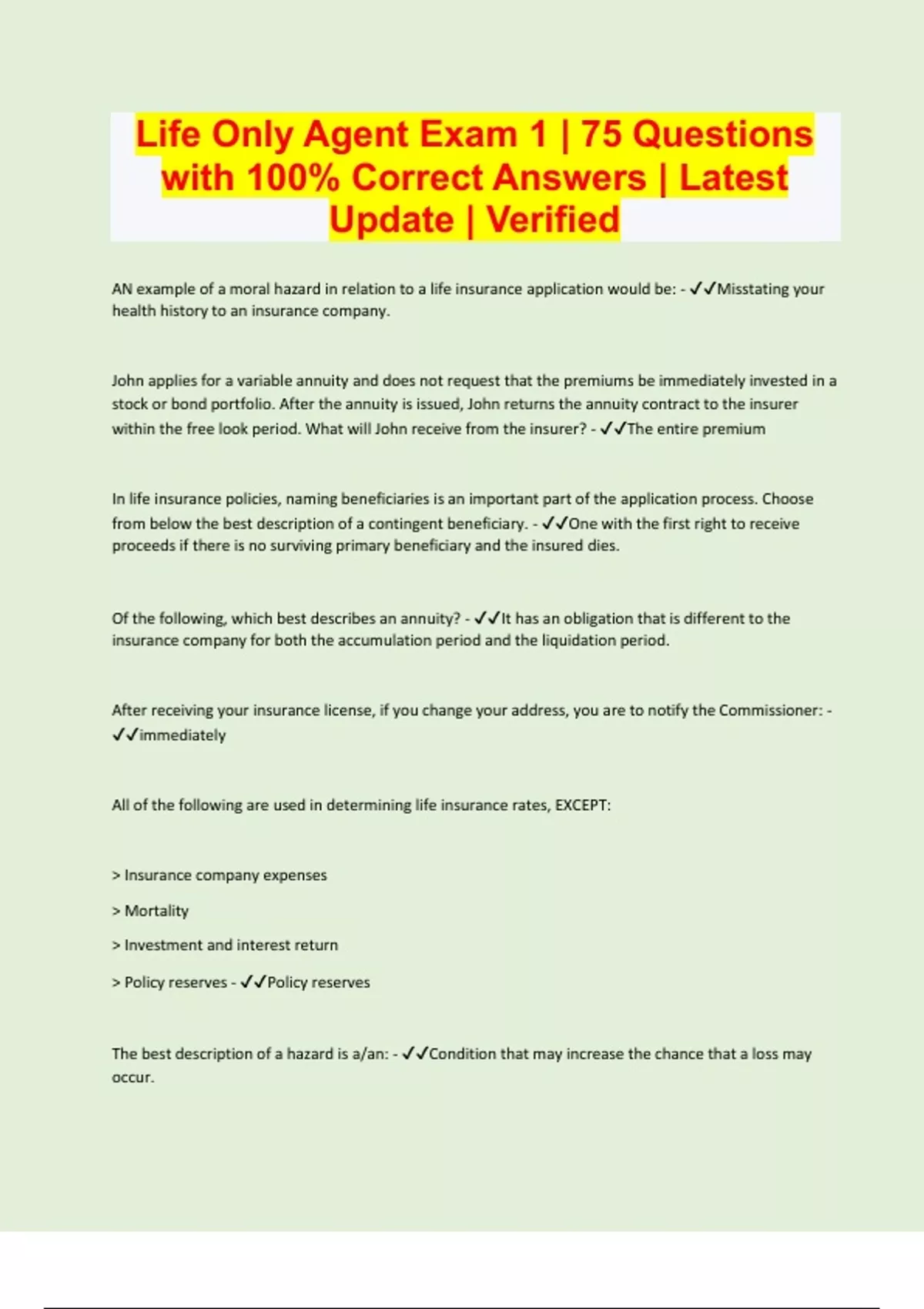 Life Only Agent Exam 1 | 75 Questions with 100% Correct Answers | Latest Update | Verified
