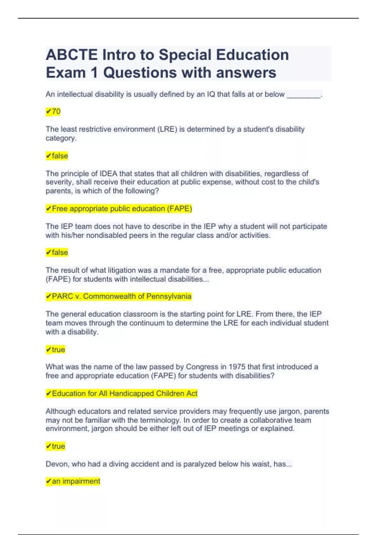 ABCTE Intro to Special Education Exam 1 Questions with answers.