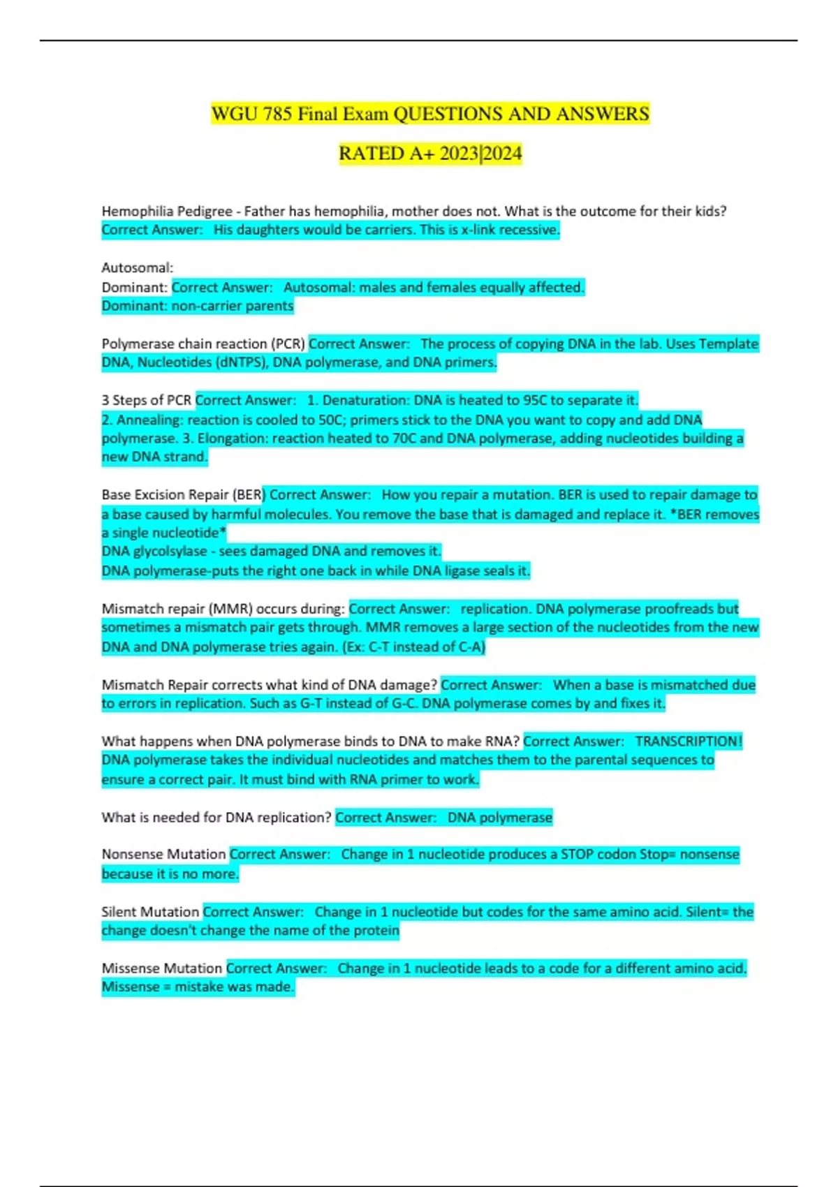 WGU 785 Final Exam QUESTIONS AND ANSWERS RATED A+ 2023|2024 Hemophilia Pedigree - Father has hemophilia, mother does not. What is the outcome for their kids? Correct Answer: His daughters would be carriers. This is x-link recessive. Autosomal: Dominant: Correct Answer: Autosomal: males and females equally affected. Dominant: non-carrier parents Polymerase chain reaction (PCR) Correct Answer: The process of copying DNA in the lab. Uses Template DNA, Nucleotides (dNTPS), DNA polymerase, and DNA primers. 3 Steps of PCR Correct Answer: 1. Denaturation: DNA is heated to 95C to separate it. 2. Annealing: reaction is cooled to 50C; primers stick to the DNA you want to copy and add DNA polymerase. 3. Elongation: reaction heated to 70C and DNA polymerase, adding nucleotides building a new DNA strand. Base Excision Repair (BER) Correct Answer: How you repair a mutation. BER is used to repair damage to a base caused by harmful molecules. You remove the base that is damaged and replace it. *BER removes a single nucleotide* DNA glycolsylase - sees damaged DNA and removes it. DNA polymerase-puts the right one back in while DNA ligase seals it. Mismatch repair (MMR) occurs during: Correct Answer: replication. DNA polymerase proofreads but sometimes a mismatch pair gets through. MMR removes a large section of the nucleotides from the new DNA and DNA polymerase tries again. (Ex: C-T instead of C-A) Mismatch Repair corrects what kind of DNA damage? Correct Answer: When a base is mismatched due to errors in replication. Such as G-T instead of G-C. DNA polymerase comes by and fixes it. What happens when DNA polymerase binds to DNA to make RNA? Correct Answer: TRANSCRIPTION! DNA polymerase takes the individual nucleotides and matches them to the parental sequences to ensure a correct pair. It must bind with RNA primer to work. What is needed for DNA replication? Correct Answer: DNA polymerase Nonsense Mutation Correct Answer: Change in 1 nucleotide produces a STOP codon Stop= nonsense because it is no more. Silent Mutation Correct Answer: Change in 1 nucleotide but codes for the same amino acid. Silent= the change doesn't change the name of the protein Missense Mutation Correct Answer: Change in 1 nucleotide leads to a code for a different amino acid. Missense = mistake was made.