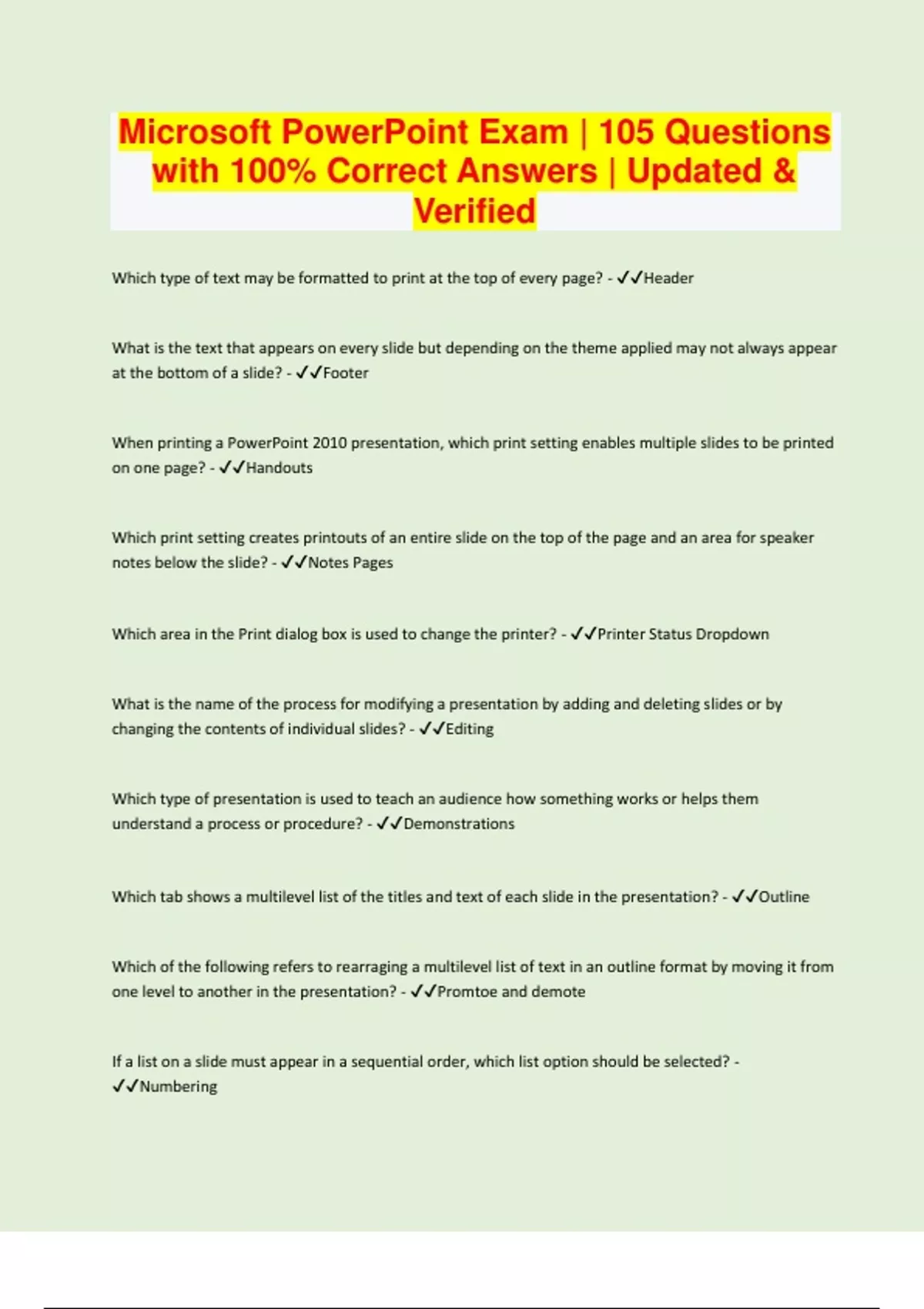 Microsoft PowerPoint Exam | 105 Questions with 100% Correct Answers | Updated & Verified
