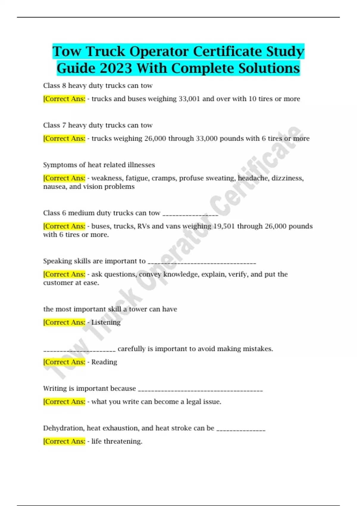 Tow Truck Operator Certificate Study Guide 2023 With Complete Solutions,Tow Truck Operator Certificate Study Guide 2023 With Complete Solutions