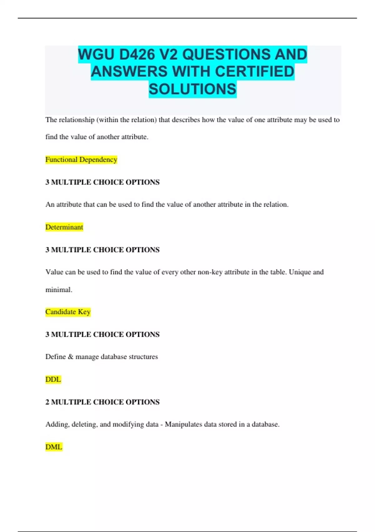 WGU D426 V2 QUESTIONS AND ANSWERS WITH CERTIFIED SOLUTIONS The relationship (within the relation) that describes how the value of one attribute may be used to find the value of another attribute. Functional Dependency 3 MULTIPLE CHOICE OPTIONS An attribute that can be used to find the value of another attribute in the relation. Determinant 3 MULTIPLE CHOICE OPTIONS Value can be used to find the value of every other non-key attribute in the table. Unique and minimal. Candidate Key 3 MULTIPLE CHOICE OPTIONS Define & manage database structures DDL 2 MULTIPLE CHOICE OPTIONS Adding, deleting, and modifying data - Manipulates data stored in a database. DML 2 MULTIPLE CHOICE OPTIONS Used to create user accounts, manage permissions and access. DCL 2 MULTIPLE CHOICE OPTIONS Includes CREATE, DROP, ALTER, TRUNCATE, RENAME DDL 2 MULTIPLE CHOICE OPTIONS A view created and stored on the database. Underlying data is changed and also updated in this view. Uses memory space. Materialized View 2 MULTIPLE CHOICE OPTIONS Not stored in memory. Only computed when used or accessed. Virtual View 2 MULTIPLE CHOICE OPTIONS The data about the data. Describes elements such as columns, names, and data type. Metadata 3 MULTIPLE CHOICE OPTIONS Ordered collection of elements in parentheses. Tuple 3 MULTIPLE CHOICE OPTIONS % of table rows selected by a query Hit Ration 3 MULTIPLE CHOICE OPTIONS Reads blocks directly, without accessing an index. Table Scan 3 MULTIPLE CHOICE OPTIONS Reads index blocks sequentially in order to locate the needed table blocks. Index Scan 2 MULTIPLE CHOICE OPTIONS Database repeatedly splits the index in two until it finds a match. Binary Search 3 MULTIPLE CHOICE OPTIONS Database object that maps one or more tables to a single file. Tablespace 3 MULTIPLE CHOICE OPTIONS Specifies tables, columns, and keys. Implements database requirements in a specific database system. Also called a schema. Logical Design 3 MULTIPLE CHOICE OPTIONS Specifies indexes, table structures, and partitions. Specifies how tables are organized on storage media. Physical Design 3 MULTIPLE CHOICE OPTIONS Components of a computer system and the relationships between components. Architecture 3 MULTIPLE CHOICE OPTIONS Interact directly with database users and administrators and send queries to the query processor. Includes Connectors & APIs, Workbench, and utility programs