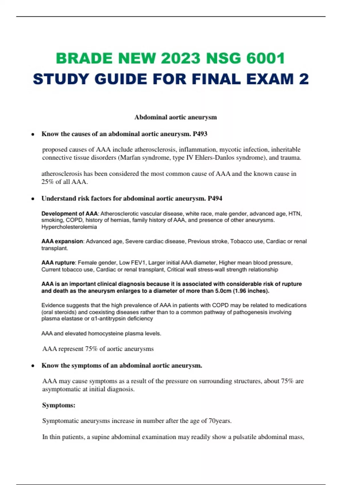 BRADE NEW 2023 NSG 6001 STUDY GUIDE FOR FINAL EXAM 2 Abdominal aortic aneurysm Know the causes of an abdominal aortic aneurysm. P493 proposed causes of AAA include atherosclerosis, inflammation, mycotic infection, inheritable connective tissue disorders (Marfan syndrome, type IV Ehlers-Danlos syndrome), and trauma. atherosclerosis has been considered the most common cause of AAA and the known cause in 25% of all AAA. Understand risk factors for abdominal aortic aneurysm. P494 Development of AAA: Atherosclerotic vascular disease, white race, male gender, advanced age, HTN, smoking, COPD, history of hernias, family history of AAA, and presence of other aneurysms. Hypercholesterolemia AAA expansion: Advanced age, Severe cardiac disease, Previous stroke, Tobacco use, Cardiac or renal transplant. AAA rupture: Female gender, Low FEV1, Larger initial AAA diameter, Higher mean blood pressure, Current tobacco use, Cardiac or renal transplant, Critical wall stress–wall strength relationship AAA is an important clinical diagnosis because it is associated with considerable risk of rupture and death as the aneurysm enlarges to a diameter of more than 5.0cm (1.96 inches). Evidence suggests that the high prevalence of AAA in patients with COPD may be related to medications (oral steroids) and coexisting diseases rather than to a common pathway of pathogenesis involving plasma elastase or α1-antitrypsin deficiency AAA and elevated homocysteine plasma levels. AAA represent 75% of aortic aneurysms Know the symptoms of an abdominal aortic aneurysm. AAA may cause symptoms as a result of the pressure on surrounding structures, about 75% are asymptomatic at initial diagnosis. Symptoms: Symptomatic aneurysms increase in number after the age of 70years. In thin patients, a supine abdominal examination may readily show a pulsatile abdominal mass, Inflammatory AAAs may be manifested with chronic abdominal pain or back pain and, sometimes, ureteral obstruction Microembolic infarcts in the lower extremity of a patient with easily palpable pedal pulses may suggest either abdominal or popliteal aneurysm. Embolization of mural thrombus from an abdominal aneurysm may be seen with acute limb ischemia caused by femoral or popliteal occlusion. Symptom and sign of a ruptured AAA classic diagnostic triad of ruptured AAA is hypotension (42%), pulsatile abdominal mass (91%), and abdominal pain (58%) or back pain (70%).