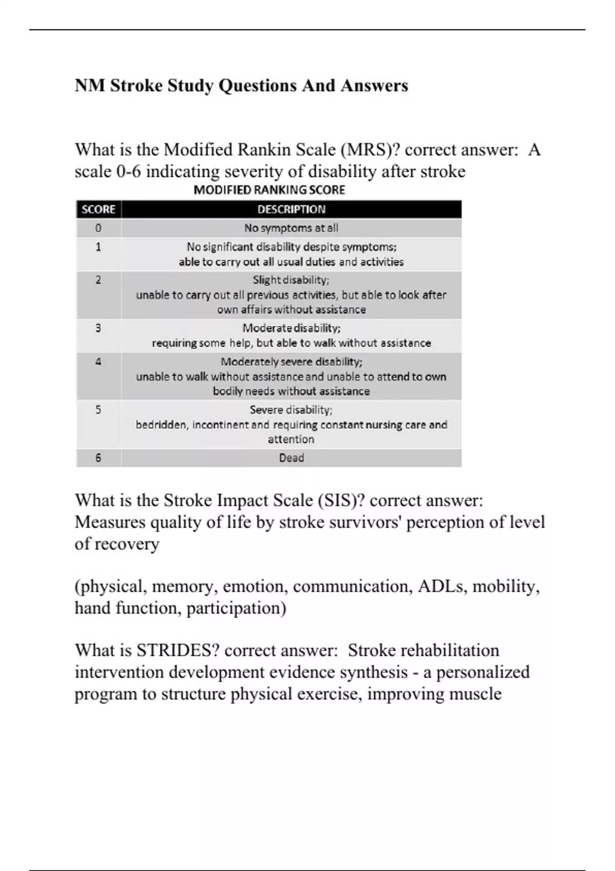 What is the Modified Rankin Scale (MRS)? correct answer: A scale 0-6 indicating severity of disability after stroke What is the Stroke Impact Scale (SIS)? correct answer: Measures quality of life by stroke survivors' perception of level of recovery (physical, memory, emotion, communication, ADLs, mobility, hand function, participation) What is STRIDES? correct answer: Stroke rehabilitation intervention development evidence synthesis - a personalized program to structure physical exercise, improving muscle strength, endurance, flexibility, balance, function, motivation, and self-management What is Masterstroke Program? correct answer: secondary stroke prevention group program, 19 weeks, 2 hour weekly session (1hr exercise & 1hr education) What is FAME? correct answer: Fitness and mobility exercise - focus on strenght, balance, walking, fitness, bone density, function, memory, reduce risk of falls, 1hr x 2-3xweekly x 4months What are aerobic activity guidelines for aging adults? correct answer: 20min x 3x weekly of vigorous OR 30min x 5x weekly of moderate What are the two stroke types and what percentage of occurrence are they? correct answer: ischemic-85% hemorrhage-15% What is arteriovenous malformation (AVM) and which type of stroke does it relate to? correct answer: a tangle of abnormal arteries and veins w/ no capillaries in between - hemorrhagic Classify large vessel ischemic stroke and how they occur correct answer: thrombotic (local obstruction): atherosclerosis, dissection, hypercoagulable conditions embolic (traveling clot or debris): blood clot (atrial fib, dissection, valvular vegetation), or ruptured atherosclerotic plaque What is another term for small vessel ischemic stroke and how it might occur correct answer: lacunar - hypertension, diabetes, cholestrol, smoking, age, basil ganglia, internal capsule, pons What arteries supply blood through the anterior circulation of the brain? correct answer: ICA -> MCA & ACA What arteries supply blood through the posterior circulation of the brain? correct answer: vertebral a -> basilar a -> PCA ACA syndrome clinical findings correct answer: contralateral hemiplegia and hemianesthesia, LE is more involved than UE, profound abulia (delay in verbal and motor response), apathy, incontinence, apraxia, impaired judgement MCA syndrome clinical findings correct answer: contralateral hemiplegia and hemianesthesia, UE more involved than LE R hemisphere affected: L homonymous hemianopia, decreased spatial awareness, and spatial neglect L hemisphere affected: R homonymous hemianopia, Wernicke's or Broca's aphasias PCA syndrome clinical findings correct answer: cont