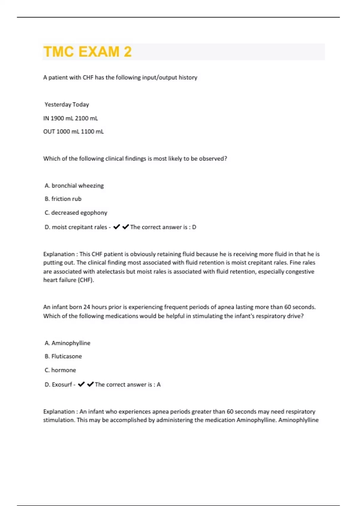 A patient with CHF has the following input/output history Yesterday Today IN 1900 mL 2100 mL OUT 1000 mL 1100 mL Which of the following clinical findings is most likely to be observed? A. bronchial wheezing B. friction rub C. decreased egophony D. moist crepitant rales - The correct answer is : D Explanation : This CHF patient is obviously retaining fluid because he is receiving more fluid in that he is putting out. The clinical finding most associated with fluid retention is moist crepitant rales. Fine rales are associated with atelectasis but moist rales is associated with fluid retention, especially congestive heart failure (CHF). An infant born 24 hours prior is experiencing frequent periods of apnea lasting more than 60 seconds. Which of the following medications would be helpful in stimulating the infant's respiratory drive? A. Aminophylline B. Fluticasone C. hormone D. Exosurf - The correct answer is : A Explanation : An infant who experiences apnea periods greater than 60 seconds may need respiratory stimulation. This may be accomplished by administering the medication Aminophylline. Aminophlyllineis only intended for ventilatory stimulation in infants. The same medication is used for long-term bronchodilation in adults. A respiratory therapist is having difficulty advancing a suction catheter down a fenestrated tracheostomy tube while the inner cannula is removed. The cannula appears to meet resistance within a few inches from insertion. The therapist should A. remove the tracheostomy tube B. twist the catheter while attempting to advance C. inflate the cuff D. obtain a smaller suction catheter - The correct answer is : B