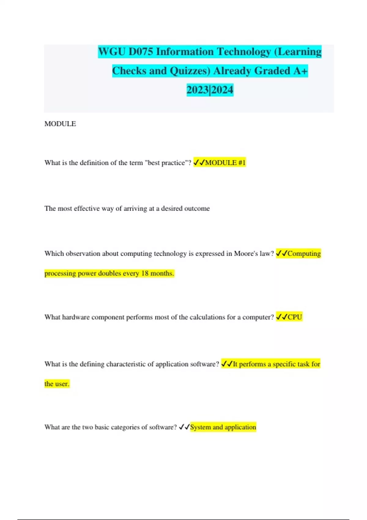 WGU D075 Information Technology (Learning Checks and Quizzes) Already Graded A+ 2023|2024 MODULE What is the definition of the term "best practice"? MODULE #1 The most effective way of arriving at a desired outcome Which observation about computing technology is expressed in Moore's law? Computing processing power doubles every 18 months. What hardware component performs most of the calculations for a computer? CPU What is the defining characteristic of application software? It performs a specific task for the user. What are the two basic categories of software? System and application