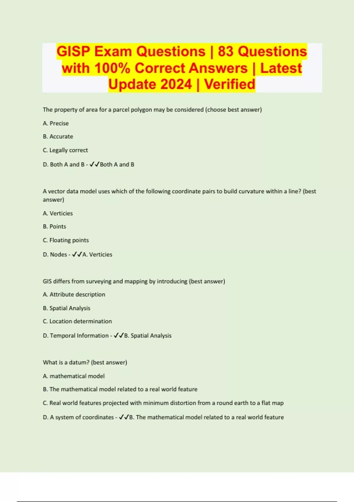 The property of area for a parcel polygon may be considered (choose best answer) A. Precise B. Accurate C. Legally correct D. Both A and B - Both A and B A vector data model uses which of the following coordinate pairs to build curvature within a line? (best answer) A. Verticies B. Points C. Floating points D. Nodes - A. Verticies GIS differs from surveying and mapping by introducing (best answer) A. Attribute description B. Spatial Analysis C. Location determination D. Temporal Information - B. Spatial Analysis What is a datum? (best answer) A. mathematical model B. The mathematical model related to a real world feature C. Real world features projected with minimum distortion from a round earth to a flat map D. A system of coordinates - B. The mathematical model related to a real world feature