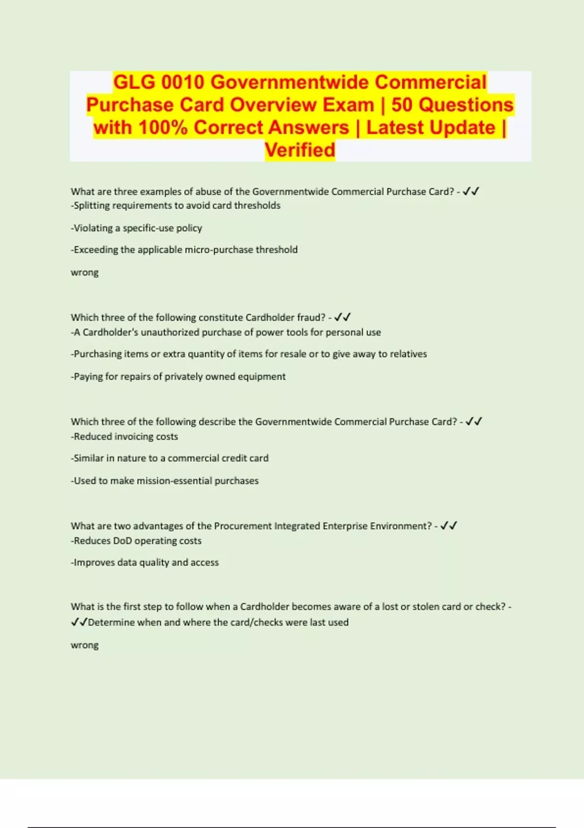GLG 0010 Governmentwide Commercial Purchase Card Overview Exam | 50 Questions with 100% Correct Answers | Latest Update | Verified