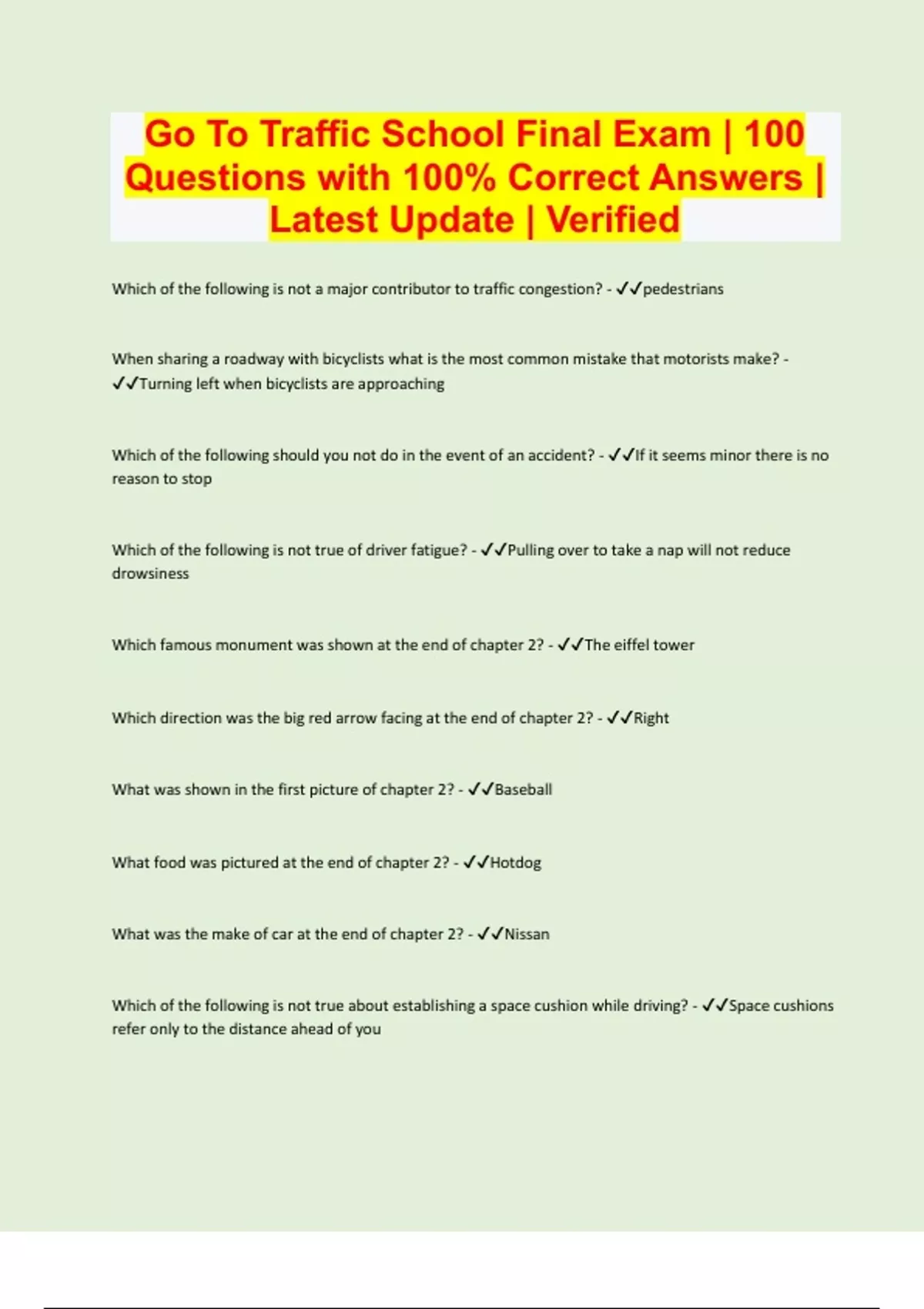 Go To Traffic School Final Exam | 100 Questions with 100% Correct Answers | Latest Update | Verified