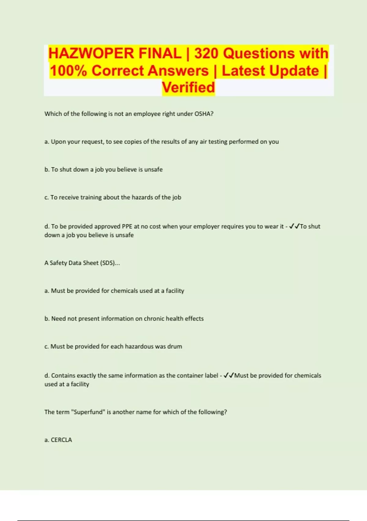 Which of the following is not an employee right under OSHA? a. Upon your request, to see copies of the results of any air testing performed on you b. To shut down a job you believe is unsafe c. To receive training about the hazards of the job d. To be provided approved PPE at no cost when your employer requires you to wear it - To shut down a job you believe is unsafe A Safety Data Sheet (SDS)... a. Must be provided for chemicals used at a facility b. Need not present information on chronic health effects c. Must be provided for each hazardous was drum d. Contains exactly the same information as the container label - Must be provided for chemicals used at a facility The term "Superfund" is another name for which of the following? a. CERCLA