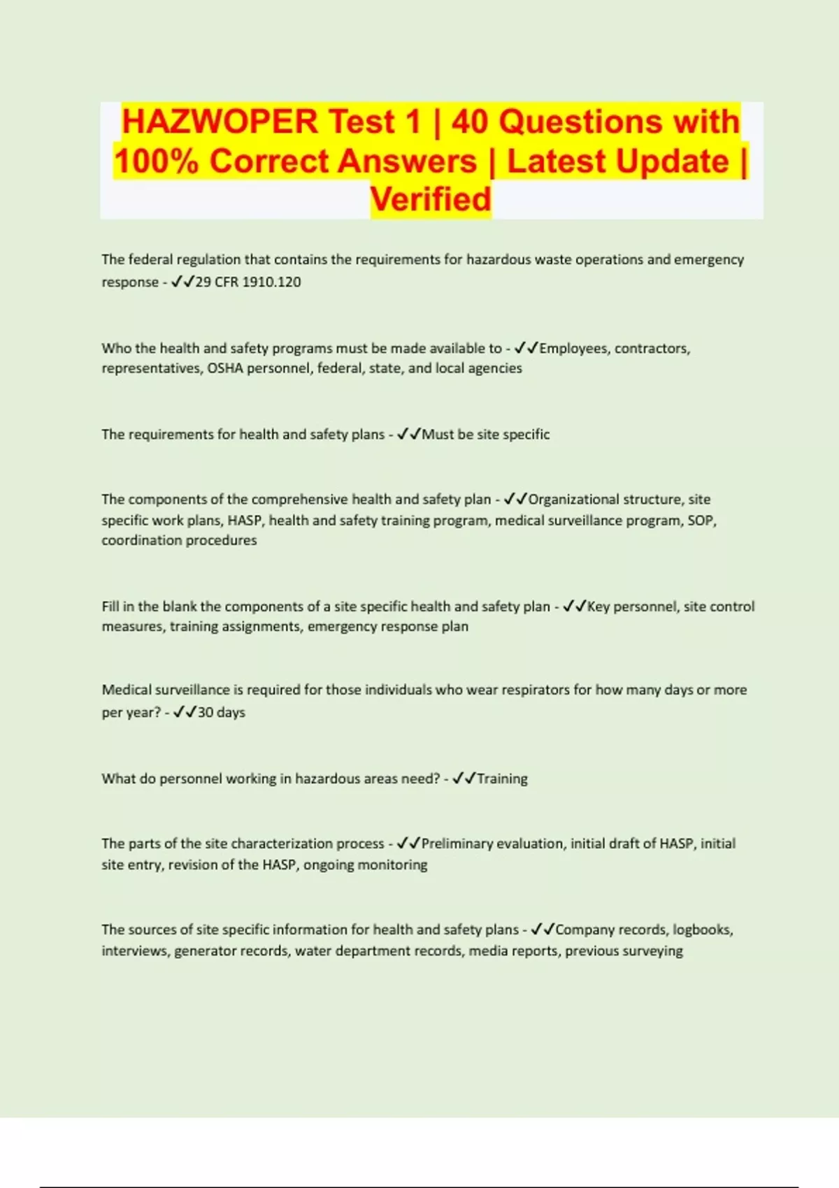 HAZWOPER Test 1 | 40 Questions with 100% Correct Answers | Latest Update | Verified