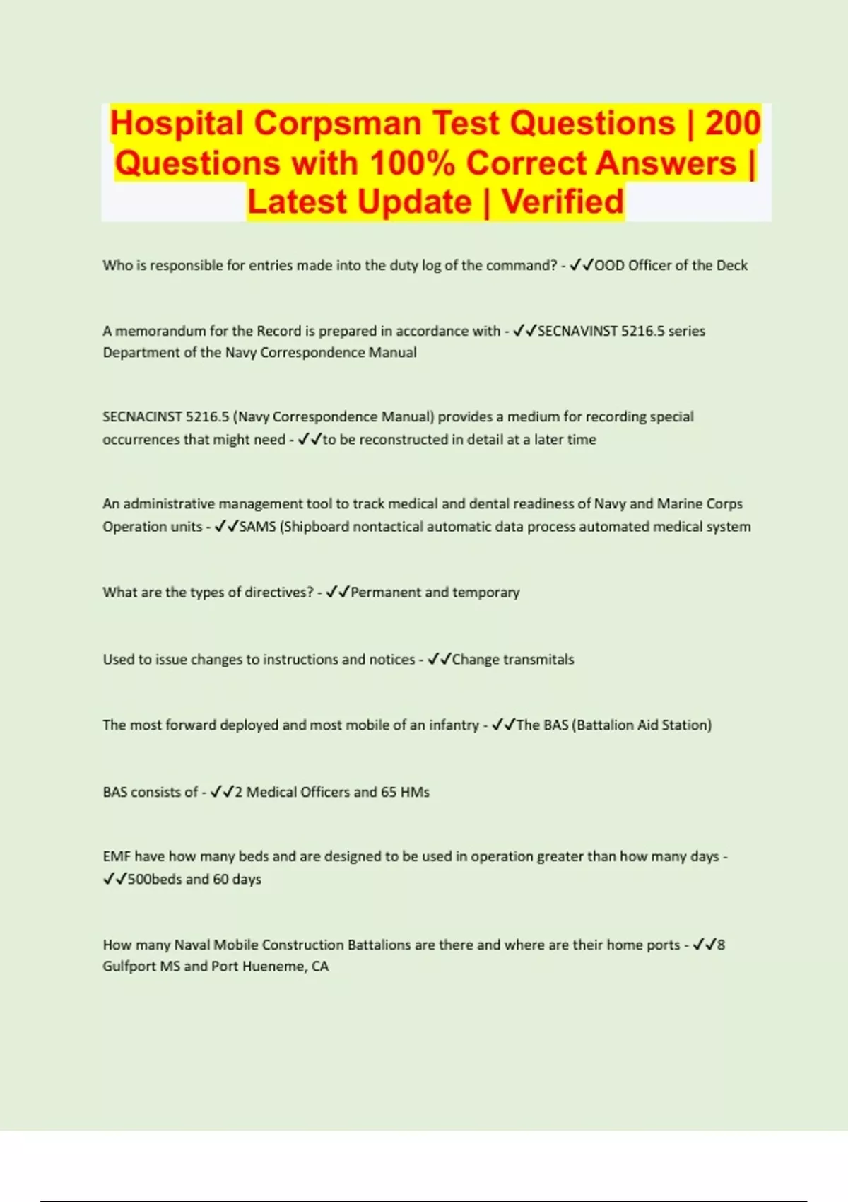 Hospital Corpsman Test Questions | 200 Questions with 100% Correct Answers | Latest Update | Verified