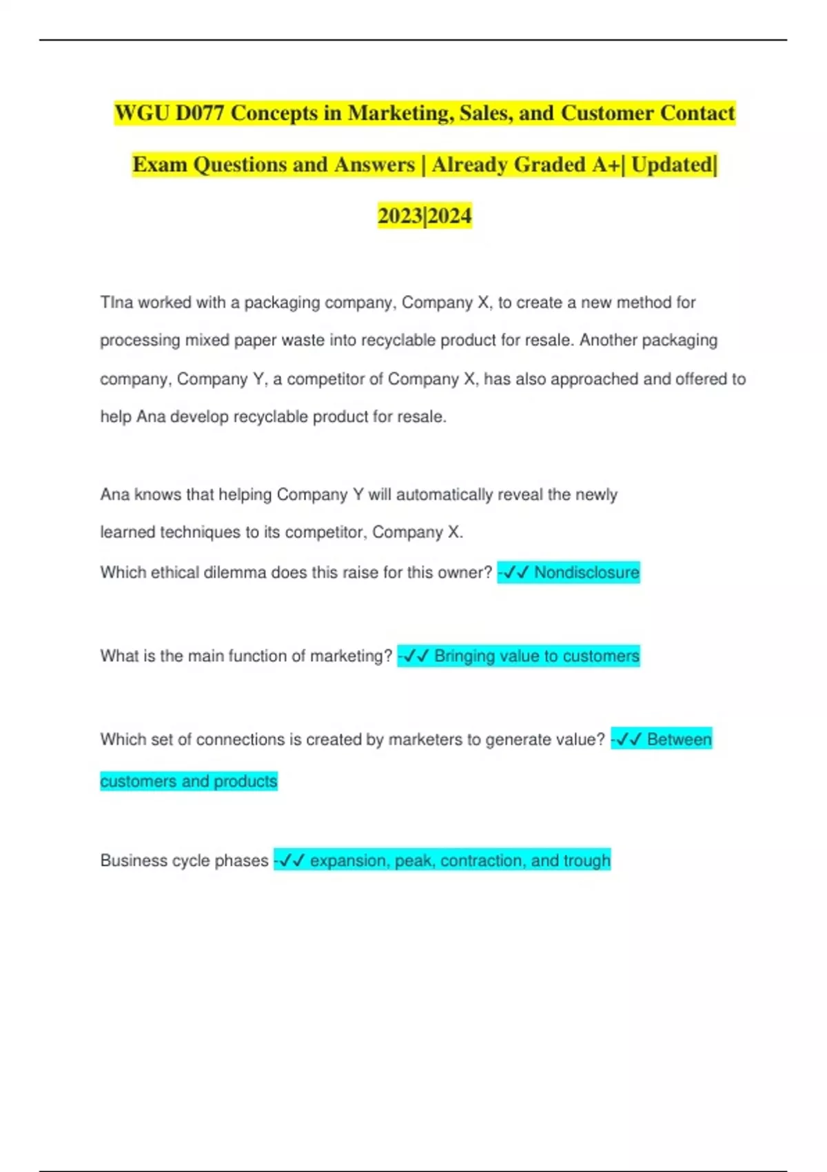 WGU D077 Concepts in Marketing, Sales, and Customer Contact Exam Questions and Answers | Already Graded A+| Updated| 2023|2024 TIna worked with a packaging company, Company X, to create a new method for processing mixed paper waste into recyclable product for resale. Another packaging company, Company Y, a competitor of Company X, has also approached and offered to help Ana develop recyclable product for resale. Ana knows that helping Company Y will automatically reveal the newly learned techniques to its competitor, Company X. Which ethical dilemma does this raise for this owner? - Nondisclosure What is the main function of marketing? - Bringing value to customers Which set of connections is created by marketers to generate value? - Between customers and products Business cycle phases - expansion, peak, contraction, and trough The director plans to post the menu for the day by 5:00 each morning. This information will include the nutrition facts associated with breakfast, lunch, and dinner, and describe the standards used in the meal preparation. Which activity is the community center using to create value through its menu marketing? - Creating awareness of fresh meals The community center is the first in the city to offer freshly prepared meals in partnership with the food warehouse. Which stage of the product life cycle do the meals represent to the community? - Introduction The director plans to design and implement a marketing campaign. Which example describes the director's primary goal for the marketing campaign? - Promoting awareness of its food offering