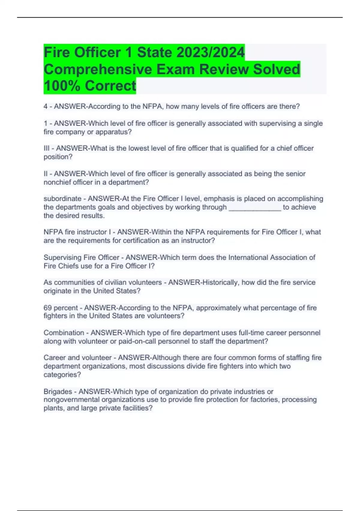 Fire officer 1 /Fire Officer II /Fire Officer III /Fire Officer IV/Florida Fire Officer Exams Package Deal -Solved