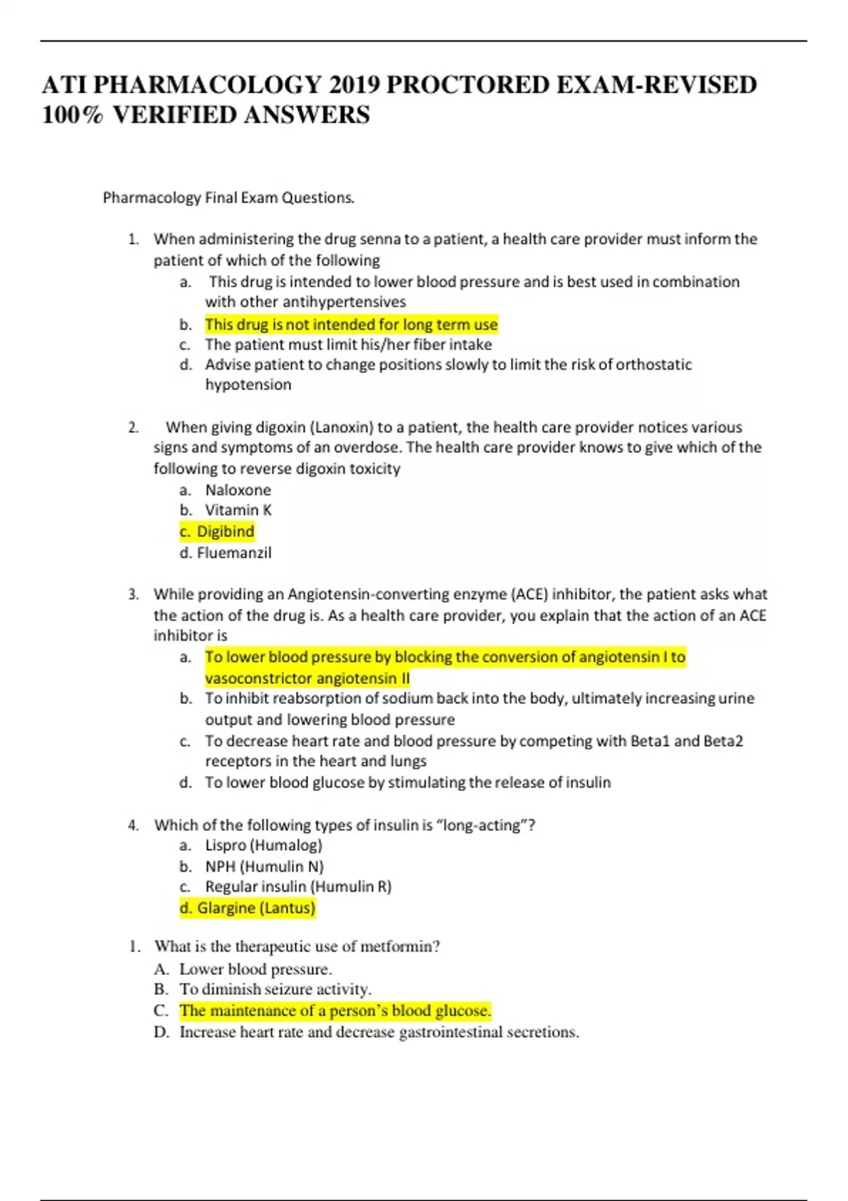 ATI PHARMACOLOGY 2019 PROCTORED EXAM-REVISED 100%CORRECT ANSWERS. ATI Pharmacology Final Exam Questions 1. When administering the drug senna to a patient, a health care provider must inform the patient of which of the following a. This drug is intended to lower blood pressure and is best used ...