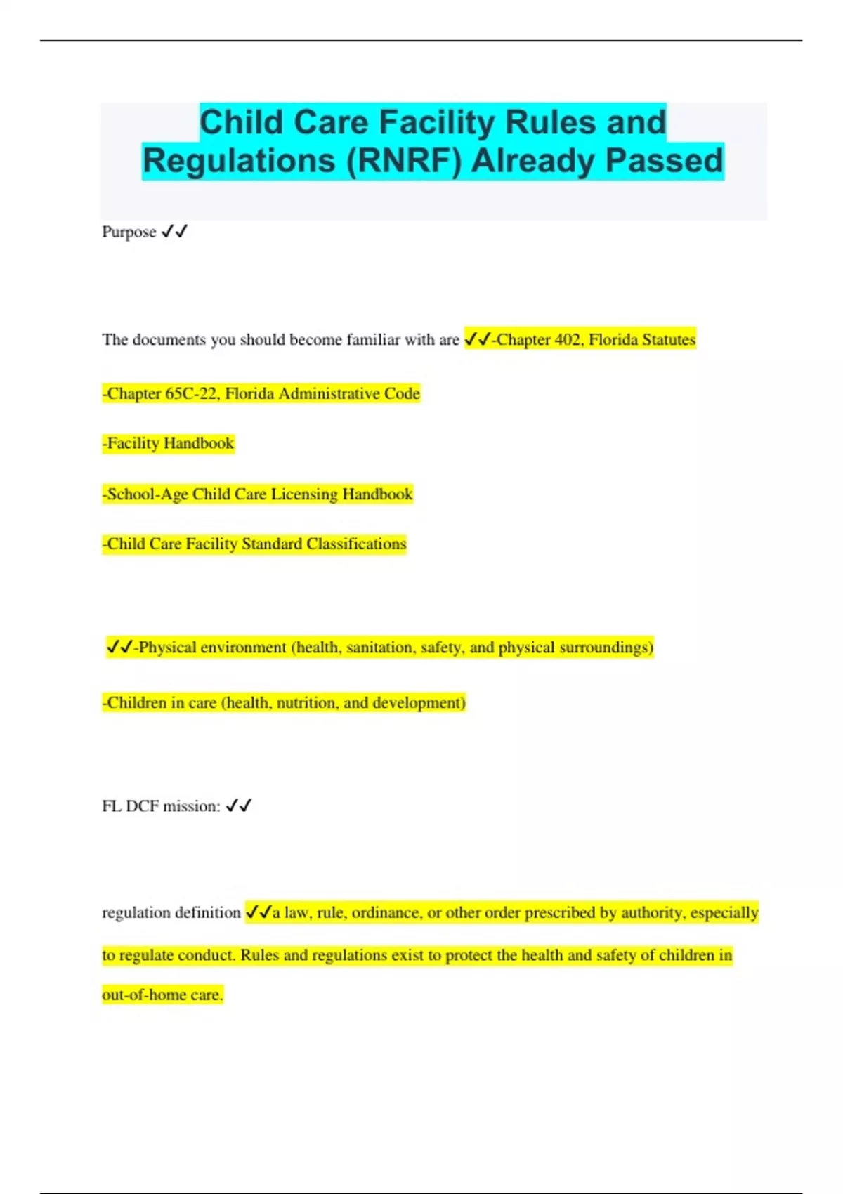 Purpose The documents you should become familiar with are -Chapter 402, Florida Statutes -Chapter 65C-22, Florida Administrative Code -Facility Handbook -School-Age Child Care Licensing Handbook -Child Care Facility Standard Classifications -Physical environment (health, sanitation, safety, and physical surroundings) -Children in care (health, nutrition, and development) FL DCF mission: regulation definition a law, rule, ordinance, or other order prescribed by authority, especially to regulate conduct. Rules and regulations exist to protect the health and safety of children in out-of-home care.