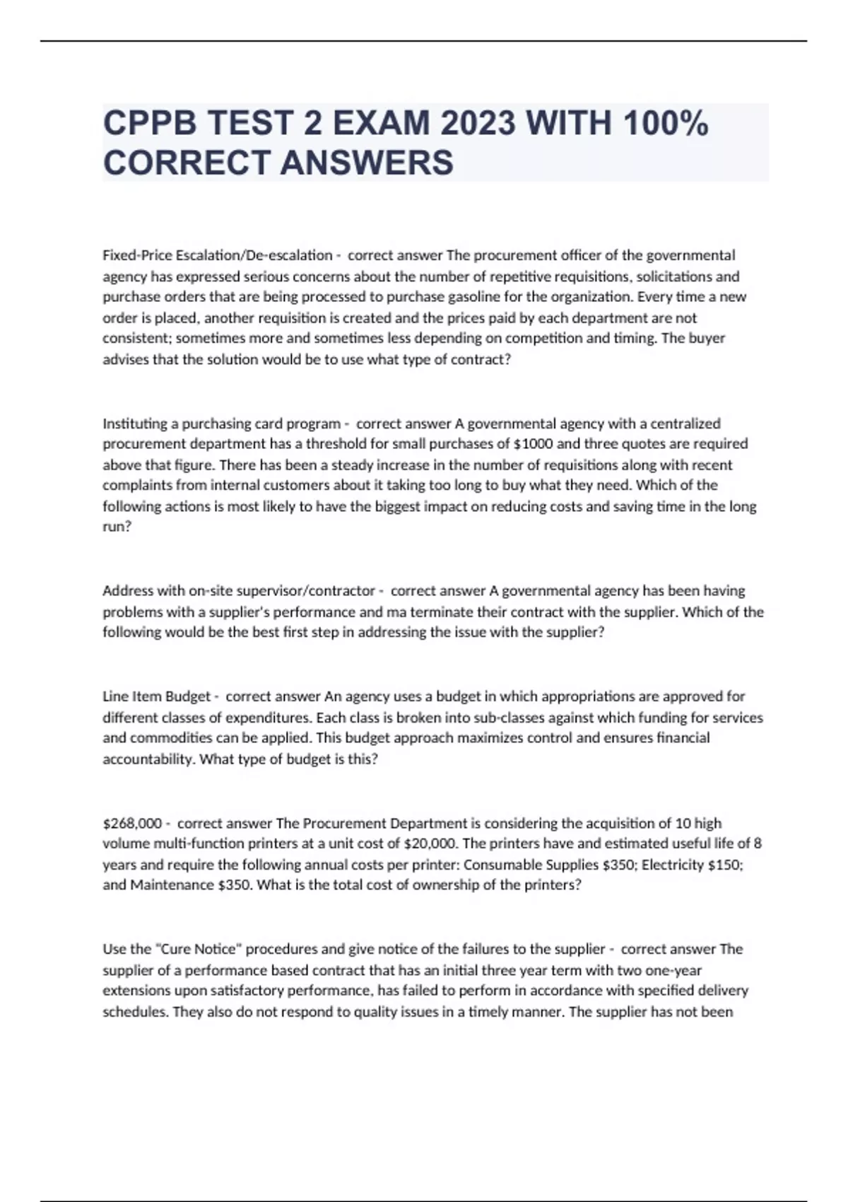 Fixed-Price Escalation/De-escalation - correct answer The procurement officer of the governmental agency has expressed serious concerns about the number of repetitive requisitions, solicitations and purchase orders that are being processed to purchase gasoline for the organization. Every time a new order is placed, another requisition is created and the prices paid by each department are not consistent; sometimes more and sometimes less depending on competition and timing. The buyer advises that the solution would be to use what type of contract? Instituting a purchasing card program - correct answer A governmental agency with a centralized procurement department has a threshold for small purchases of $1000 and three quotes are required above that figure. There has been a steady increase in the number of requisitions along with recent complaints from internal customers about it taking too long to buy what they need. Which of the following actions is most likely to have the biggest impact on reducing costs and saving time in the long run? Address with on-site supervisor/contractor - correct answer A governmental agency has been having problems with a supplier's performance and ma terminate their contract with the supplier. Which of the following would be the best first step in addressing the issue with the supplier? Line Item Budget - correct answer An agency uses a budget in which appropriations are approved for different classes of expenditures. Each class is broken into sub-classes against which funding for services and commodities can be applied. This budget approach maximizes control and ensures financial accountability. What type of budget is this? $268,000 - correct answer The Procurement Department is considering the acquisition of 10 high volume multi-function printers at a unit cost of $20,000. The printers have and estimated useful life of 8 years and require the following annual costs per printer: Consumable Supplies $350; Electricity $150; and Maintenance $350. What is the total cost of ownership of the printers? Use the "Cure Notice" procedures and give notice of the failures to the supplier - correct answer The supplier of a performance based contract that has an initial three year term with two one-year extensions upon satisfactory performance, has failed to perform in accordance with specified delivery schedules. They also do not respond to quality issues in a timely manner. The supplier has not been given for