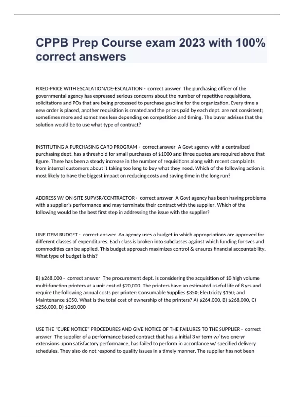 FIXED-PRICE WITH ESCALATION/DE-ESCALATION - correct answer The purchasing officer of the governmental agency has expressed serious concerns about the number of repetitive requisitions, solicitations and POs that are being processed to purchase gasoline for the organization. Every time a new order is placed, another requisition is created and the prices paid by each dept. are not consistent; sometimes more and sometimes less depending on competition and timing. The buyer advises that the solution would be to use what type of contract? INSTITUTING A PURCHASING CARD PROGRAM - correct answer A Govt agency with a centralized purchasing dept. has a threshold for small purchases of $1000 and three quotes are required above that figure. There has been a steady increase in the number of requisitions along with recent complaints from internal customers about it taking too long to buy what they need. Which of the following action is most likely to have the biggest impact on reducing costs and saving time in the long run? ADDRESS W/ ON-SITE SUPVSR/CONTRACTOR - correct answer A Govt agency has been having problems with a supplier's performance and may terminate their contract with the supplier. Which of the following would be the best first step in addressing the issue with the supplier? LINE ITEM BUDGET - correct answer An agency uses a budget in which appropriations are approved for different classes of expenditures. Each class is broken into subclasses against which funding for svcs and commodities can be applied. This budget approach maximizes control & ensures financial accountability. What type of budget is this? B) $268,000 - correct answer The procurement dept. is considering the acquisition of 10 high volume multi-function printers at a unit cost of $20,000. The printers have an estimated useful life of 8 yrs and require the following annual costs per printer: Consumable Supplies $350; Electricity $150; and Maintenance $350. What is the total cost of ownership of the printers? A) $264,000, B) $268,000, C) $256,000, D) $260,000