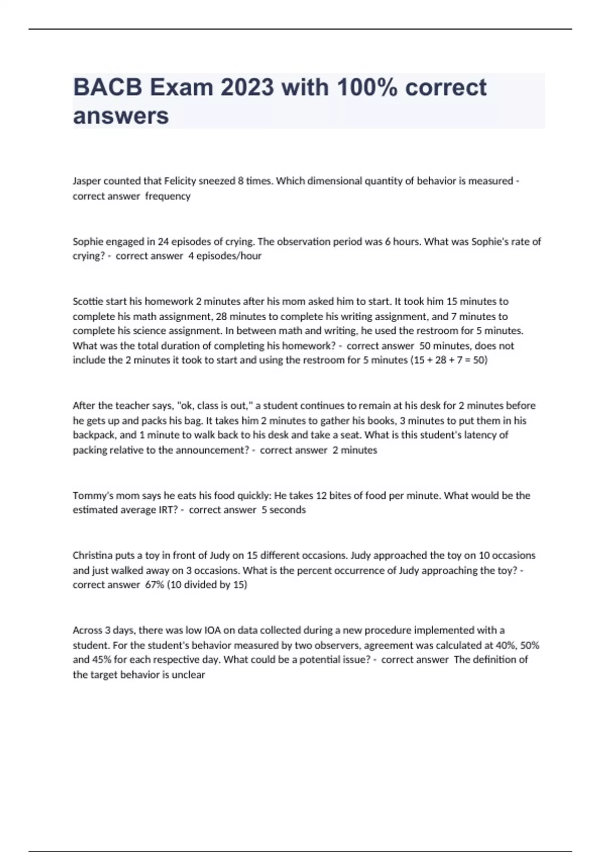 Arbitrary Stimulus Class - correct answer An arbitrary response class contains stimuli that evoke the same response but do not share a common physical feature. The women's restroom signs are all different in their physical features: one contains an English word, one contains the universal symbol for women, and the other is a stylized female. The other examples are all feature stimulus classes, in that they share common physical forms. Stimulus Discrimination - correct answer reinforcing reponses in the presence of the discriminative stimulus and withholding reinforcement in the presence of the stimulus deltas Stimulus discrimination involves the behavior principles of - correct answer reinforcement and extinction response prompt - correct answer operates directly on the response stimulus prompt - correct answer operates on the antecedent task stimuli stimulus equivalence - correct answer Provides a methodology for efficient teaching-expanding learners' skills far beyond what is directly taught. - Stimulus equivalence should probably be the goal of all instruction. That is, if we can teach learners a few related stimulus-stimulus relations (not stimulus-response relations) and learners can put those together to broaden their learning well beyond that of what was directly taught, then this is a very efficient form of teaching and should be viewed as the "big prize" of education. This procedure has been studied in many areas of complex verbal relations, including reading, language arts, and math. It is hardly a "theoretical construct that has not been studied much." Stimulus Control - correct answer Occurs when the rate, latency, duration or amplitude of a response is altered in the presence of an antecedent stimulus EX: stop sign, green light, red light