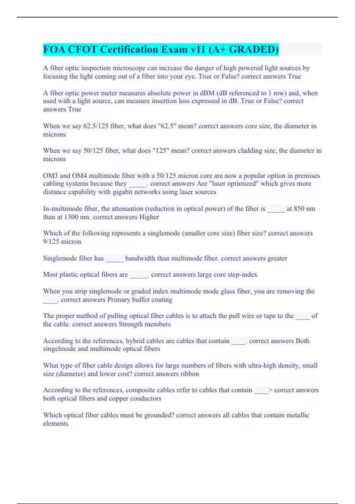 A fiber optic inspection microscope can increase the danger of high powered light sources by focusing the light coming out of a fiber into your eye. True or False? correct answers True A fiber optic power meter measures absolute power in dBM (dB referenced to 1 mw) and, when used with a light source, can measure insertion loss expressed in dB. True or False? correct answers True When we say 62.5/125 fiber, what does "62.5" mean? correct answers core size, the diameter in microns When we say 50/125 fiber, what does "125" mean? correct answers cladding size, the diameter in microns OM3 and OM4 multimode fiber with a 50/125 micron core are now a popular option in premises cabling systems because they _____. correct answers Are "laser optimized" which gives more distance capability with gigabit networks using laser sources In-multimode fiber, the attenuation (reduction in optical power) of the fiber is _____ at 850 nm than at 1300 nm. correct answers Higher Which of the following represents a singlemode (smaller core size) fiber size? correct answers 9/125 micron Singlemode fiber has _____ bandwidth than multimode fiber. correct answers greater Most plastic optical fibers are _____. correct answers large core step-index When you strip singlemode or graded index multimode mode glass fiber, you are removing the ____. correct answers Primary buffer coating The proper method of pulling optical fiber cables is to attach the pull wire or tape to the ____ of the cable. correct answers Strength members According to the references, hybrid cables are cables that contain ____. correct answers Both singelmode and multimode optical fibers What type of fiber cable design allows for large numbers of fibers with ultra-high density, small size (diameter) and lower cost? correct answers ribbon According to the references, composite cables refer to cables that contain ____ correct answers both optical fibers and copper conductors Which optical fiber cables must be grounded? correct answers all cables that contain metallic elements