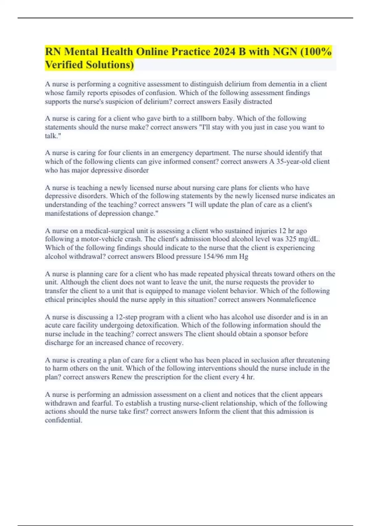 RN Mental Health Online Practice 2024 B with NGN (100% Verified Solutions)