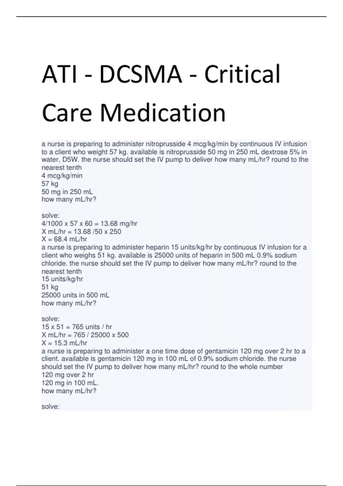 ATI - DCSMA - Critical Care Medication a nurse is preparing to administer nitroprusside 4 mcg/kg/min by continuous IV infusion to a client who weight 57 kg. available is nitroprusside 50 mg in 250 mL dextrose 5% in water, D5W. the nurse should set the IV pump to deliver how many mL/hr? round to the nearest tenth 4 mcg/kg/min 57 kg 50 mg in 250 mL how many mL/hr? solve: 4/1000 x 57 x 60 = 13.68 mg/hr X mL/hr = 13.68 /50 x 250 X = 68.4 mL/hr a nurse is preparing to administer heparin 15 units/kg/hr by continuous IV infusion for a client who weighs 51 kg. available is 25000 units of heparin in 500 mL 0.9% sodium chloride. the nurse should set the IV pump to deliver how many mL/hr? round to the nearest tenth 15 units/kg/hr 51 kg 25000 units in 500 mL how many mL/hr? solve: 15 x 51 = 765 units / hr X mL/hr = 765 / 25000 x 500 X = 15.3 mL/hr a nurse is preparing to administer a one time dose of gentamicin 120 mg over 2 hr to a client. available is gentamicin 120 mg in 100 mL of 0.9% sodium chloride. the nurse should set the IV pump to deliver how many mL/hr? round to the whole number 120 mg over 2 hr 120 mg in 100 mL. how many mL/hr? solve: 120 / 2 = 60 mg/hr X mL/hr = 60 / 120 x 100 X = 50 mL/hr a nurse is preparing to administer nitroglycerin 50 mcg/min by continuous IV infusion. available is nitroglycerin 25 mg in 250 mL dextrose 5% in water D5W. the nurse should set the IV pump to deliver how many mL/hr? round to the whole number 50 mcg/min 25 mg in 250 mL how many mL/hr? solve 50 / 1000 x 60 = 3 mg / hr X mL/hr = 3 / 25 x 250 X = 30 mL/hr a nurse is preparing to administer regular insulin 0.1 unit/kg/hr by continuous IV infusion to a client who weighs 60 kg. the amount available is regular insulin 50 units in 50 mL of sodium chloride. the nurse should set the IV pump to deliver how many mL/hr? round to the whole number 0.1 unit/kg/hr 60 kg 50 unit in 50 mL how many mL/hr? solve 0.1 x 60 = 6 unit/hr X ml/hr = 6/50 x 50 X = 6 mL/hr a nurse is preparing to administer potassium chloride 40 mEq to infuse over 4 hr to a client. available is potassium chloride 40 mEq in 100 mL dextrose 5% in 0.45% sodium chloride, D5 1/2NaCl). the nurse should set the infusion pump to deliver how many mL/hr? round to the whole number 40 mEq over 4 hr 40 mEq in 100 mL how many mL/hr? solve 40/4 = 10 mEq/hr X ml/hr = 10 / 40 x 100 X = 25 mL/hr a nurse is preparing to administer heparin 15 units/kg/hr by continuous IV infusion to a client who weighs 72 kg. available is 25000 units of heparin in 500 mL 0.9% sodium chloride. the nurse should set the IV pump to deliver how many ml/hr? round to the nearest tenth 15 units/kg/hr 72 kg 25000 units in 500 mL how many ml/hr? solve 15 x 72 = 1080 units/hr X ml/hr = 1080/25000 x 500 X = 21.6 mL/hr a nurse is preparing to administer 0.45% sodium chloride 750 mL IV to infuse over 2 hr to a client. the nurse should set the IV pump to deliver how many mL/hr? round to the whole number 750 mL over 2 hr how many ml/hr? solve X ml/hr = 750 / 2 X = 375 ml/hr a nurse is preparing to administer 0.9% sodium chloride, NaCl 1200 mL IV to infuse over 6 hr to a client. the nurse should set the IV pump to deliver how many mL/hr? round to the whole number 1200 mL over 6 hr