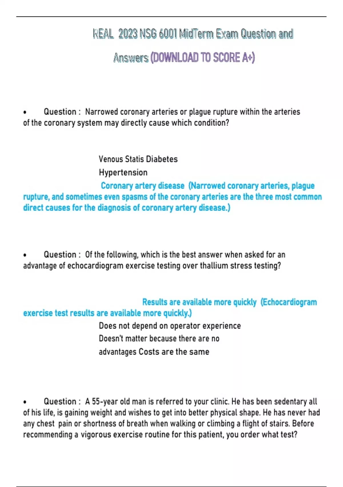 REAL 2023 NSG 6001 MidTerm Exam Question and Answers (DOWNLOAD TO SCORE A+) Question : Narrowed coronary arteries or plague rupture within the arteries of the coronary system may directly cause which condition? Venous Statis Diabetes Hypertension Coronary artery disease (Narrowed coronary arteries, plague rupture, and sometimes even spasms of the coronary arteries are the three most common direct causes for the diagnosis of coronary artery disease. ) Question : Of the following, which is the best answer when asked for an advantage of echocardiogram exercise testing over thallium stress testing? Results are available more quickly (Echocardiogram exercise test results are available more quickly.) Does not depend on operator experience Doesn’t matter because there are no advantages Costs are the same Question : A 55-year old man is referred to your clinic. He has been sedentary all of his life, is gaining weight and wishes to get into better physical shape. He has never had any chest pain or shortness of breath when walking or climbing a flight of stairs. Before recommending a vigorous exercise routine for this patient, you order what test? : Stool samples CBC ETT (Many patients have underlying CAD but remain asymptomatic. Before beginning any new vigorous activities after years of sedentary lifestyle, it is recommended that the patient obtains an ETT to rule out underlying CAD.) Thyroid levels Question : What ECG changes can reduce the specificity of the ETT? Paced rhythm and resting bundle branch block (The ECG changes that can reduce the specificity of the ETT are paced rhythm and resting bundle branch block. ) Low voltage up sloping of the ST- segment Exercise induced bundle branch blocks Paced rhythm and exercise induced bundle branch blocks Question : In women, you need to know the limitations of certain tests for CAD. For example, single-photon emissions CT imaging, while an acceptable test for most men and some women, is technically limited in women for two reasons. From the following, choose the best possible answer. Breasts and fat deposits in abdomen Smoking rates and lack of uptake of photons Breasts and smaller coronary arteries (Single-photon emissions CT imaging is technically limited in women due to breasts and smaller coronary arteries.) Multiple vessel disease and fat deposits Question : Improvements in the delivery and management of healthcare are necessary if we are to improve the overall health of this nation’s population. Which of the following are identified in your readings as strategic in the movement to improve the healthcare system? : Monetary savings and limited disruption in healthcare delivery Population management and healthcare practice (Population management and healthcare practice are strategic in the movement to improve the nation’s healthcare system. ) Socialized medicine and governmental controls President and Congress