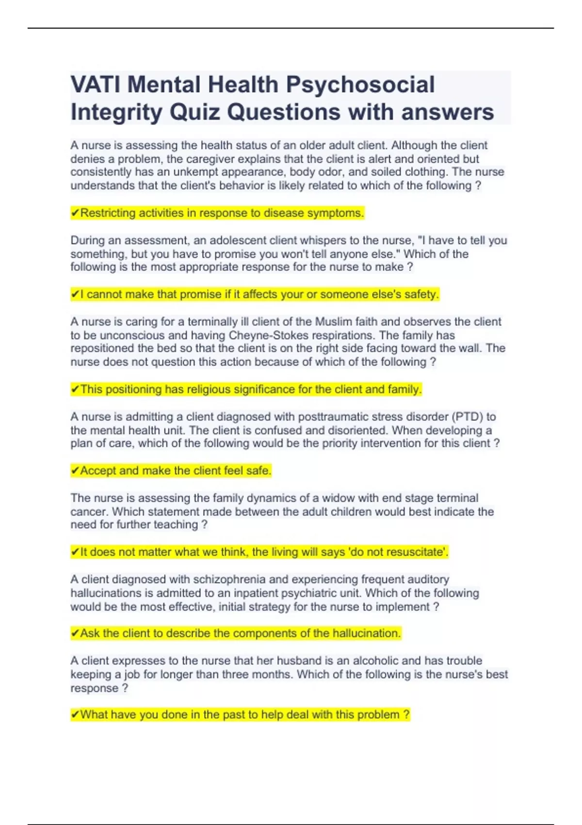 VATI Mental Health Psychosocial Integrity Quiz Questions with answers