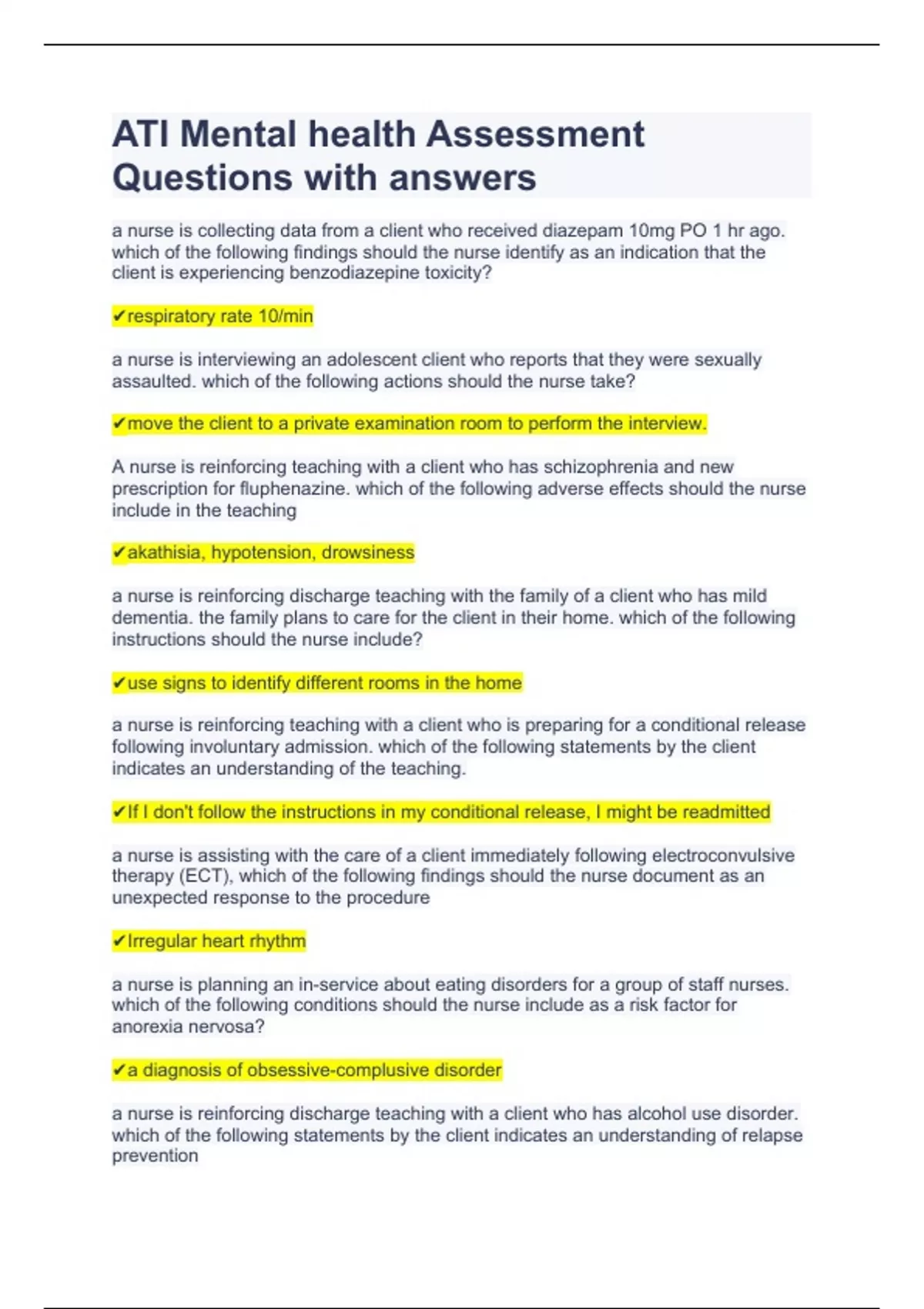 ati mental health assessment questions with answer