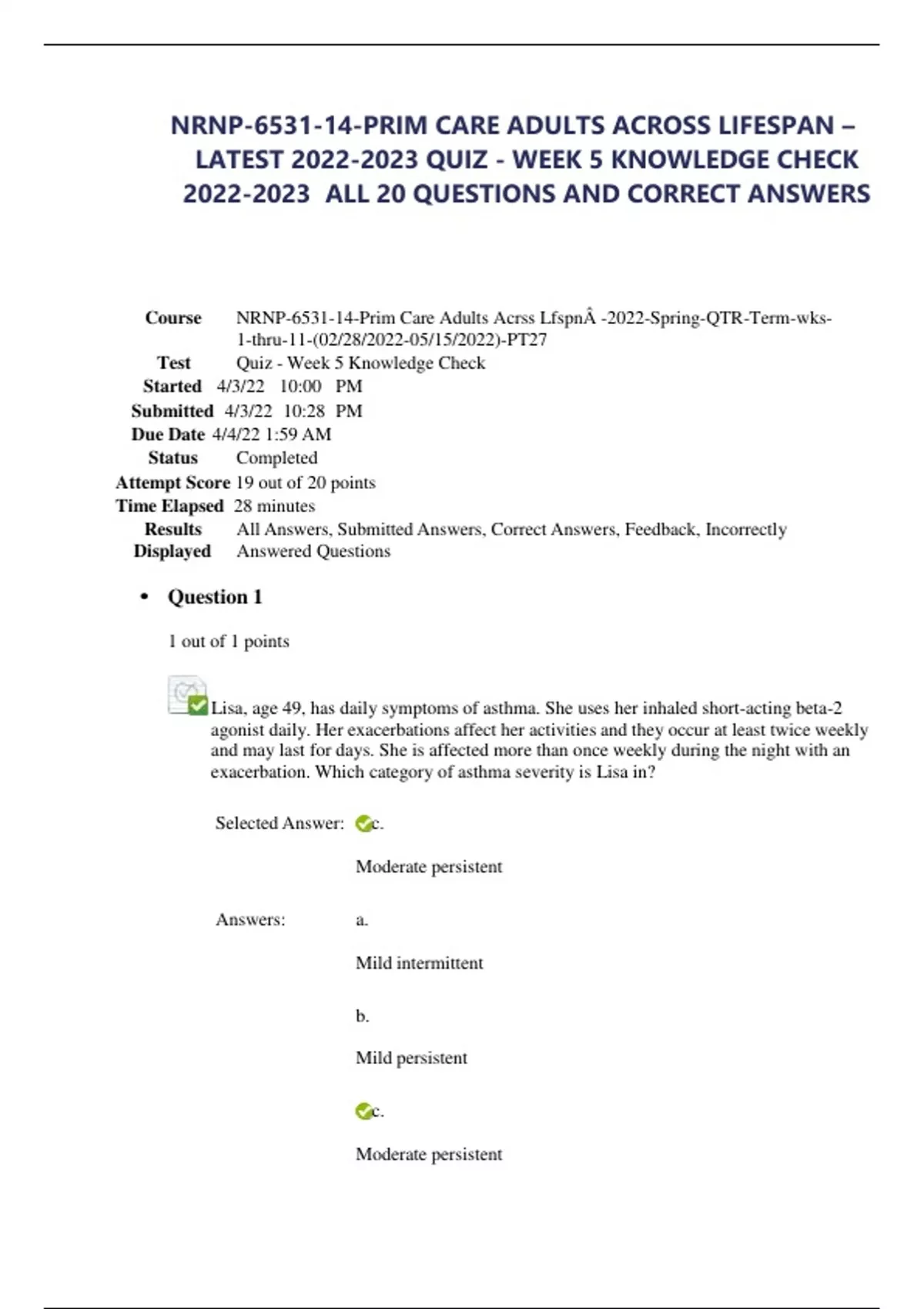 NRNP-6531-14-PRIM CARE ADULTS ACROSS LIFESPAN – LATEST QUIZ - WEEK 5 KNOWLEDGE CHECK ALL 20 QUESTIONS AND CORRECT ANSWERS