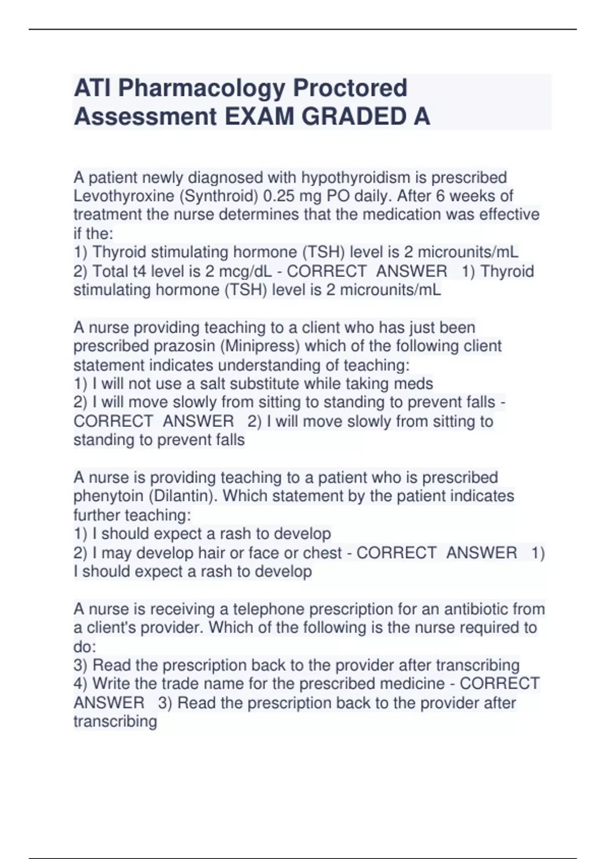 ATI Pharmacology Proctored Assessment EXAM GRADED A A patient newly diagnosed with hypothyroidism is prescribed Levothyroxine (Synthroid) 0.25 mg PO daily. After 6 weeks of treatment the nurse determines that the medication was effective if the: 1) Thyroid stimulating hormone (TSH) level is 2 microunits/mL 2) Total t4 level is 2 mcg/dL - CORRECT ANSWER 1) Thyroid stimulating hormone (TSH) level is 2 microunits/mL A nurse providing teaching to a client who has just been prescribed prazosin (Minipress) which of the following client statement indicates understanding of teaching: 1) I will not use a salt substitute while taking meds 2) I will move slowly from sitting to standing to prevent falls - CORRECT ANSWER 2) I will move slowly from sitting to standing to prevent falls A nurse is providing teaching to a patient who is prescribed phenytoin (Dilantin). Which statement by the patient indicates further teaching: 1) I should expect a rash to develo