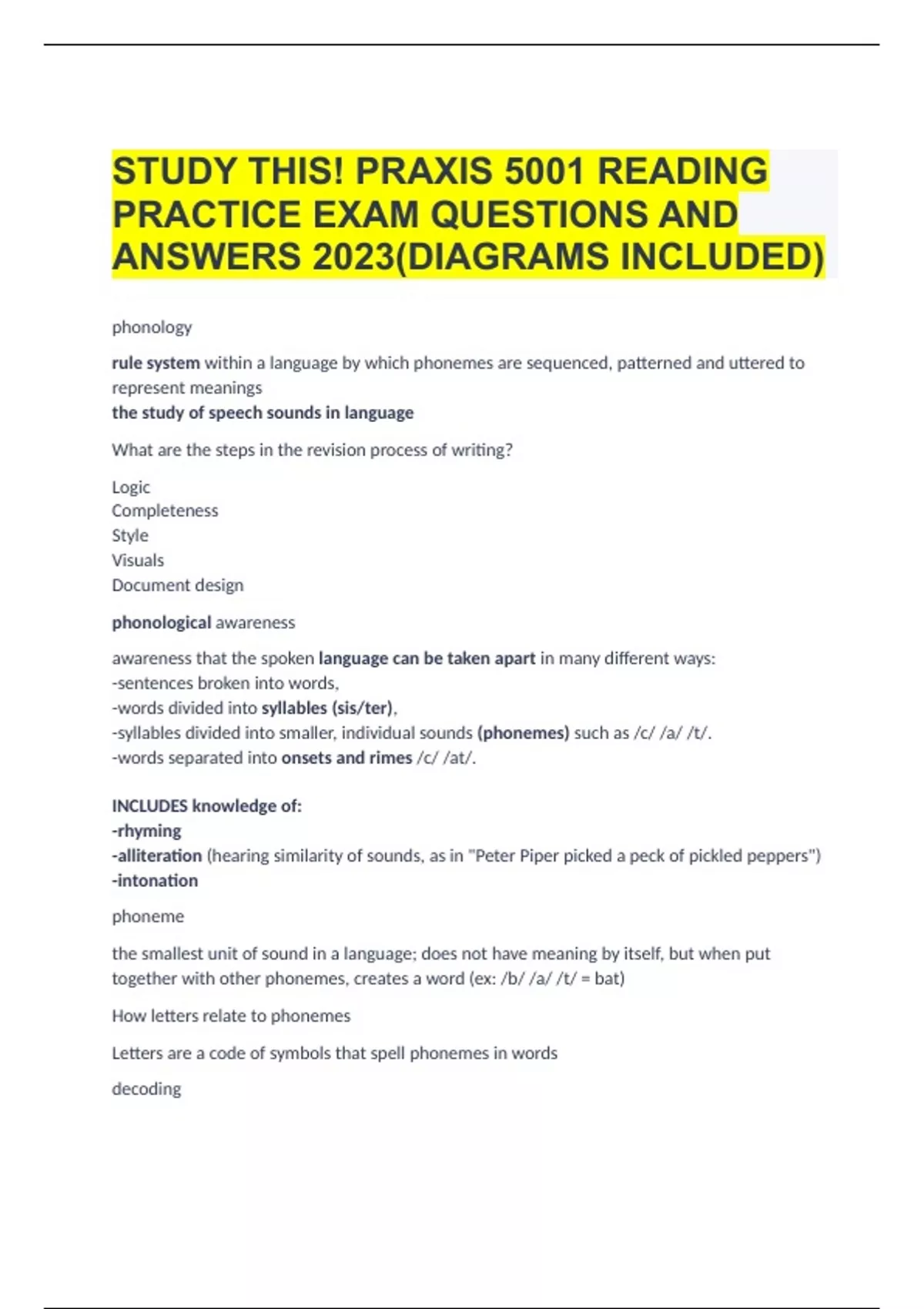 STUDY THIS! PRAXIS 5001 READING PRACTICE EXAM QUESTIONS AND ANSWERS 2023(DIAGRAMS INCLUDED)