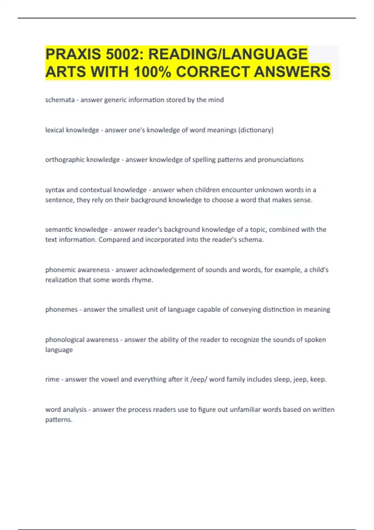 PRAXIS 5002 :READING/ LANGUAGE ARTS WITH 100% CORRECT ANSWERS