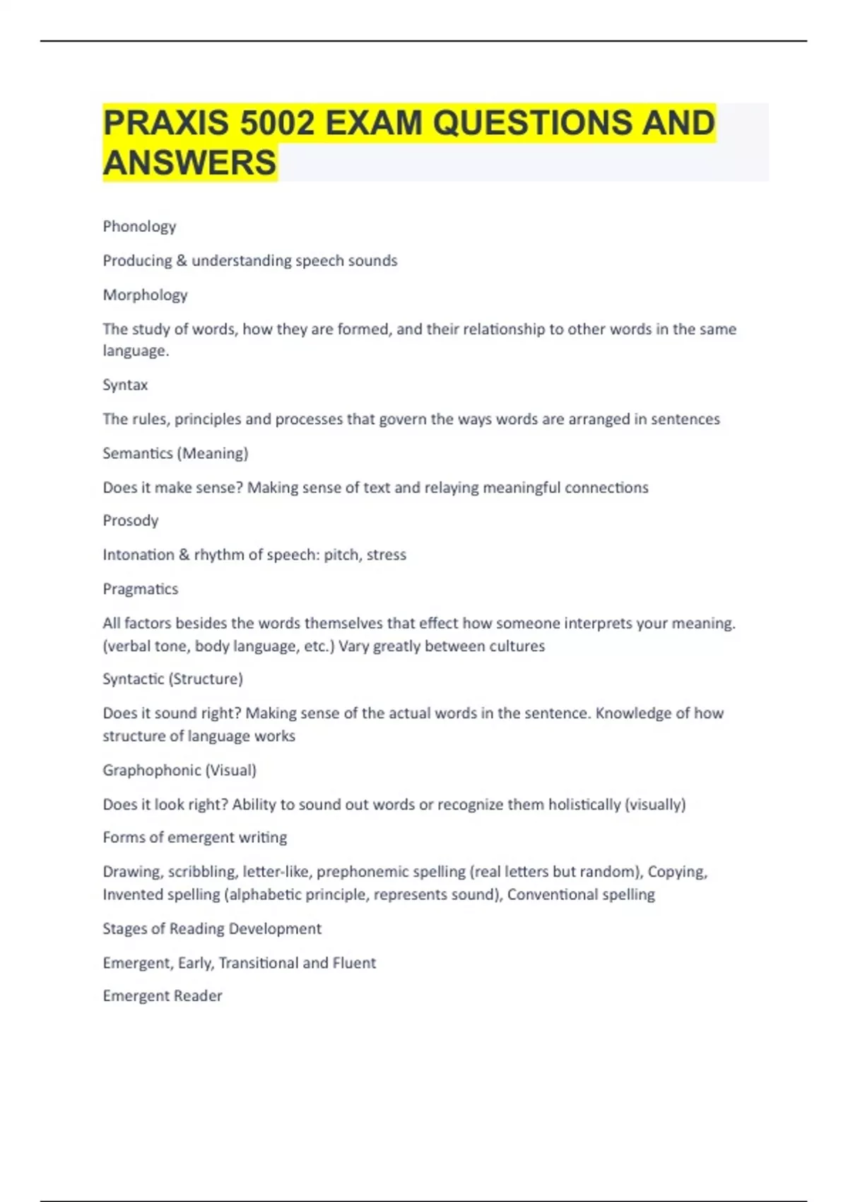 Phonology Producing & understanding speech sounds Morphology The study of words, how they are formed, and their relationship to other words in the same language. Syntax The rules, principles and processes that govern the ways words are arranged in sentences Semantics (Meaning) Does it make sense? Making sense of text and relaying meaningful connections Prosody Intonation & rhythm of speech: pitch, stress Pragmatics All factors besides the words themselves that effect how someone interprets your meaning. (verbal tone, body language, etc.) Vary greatly between cultures Syntactic (Structure) Does it sound right? Making sense of the actual words in the sentence. Knowledge of how structure of language works Graphophonic (Visual) Does it look right? Ability to sound out words or recognize them holistically (visually) Forms of emergent writing Drawing, scribbling, letter-like, prephonemic spelling (real letters but random), Copying, Invented spelling (alphabetic principle, represents sound), Conventional spelling Stages of Reading Development Emergent, Early, Transitional and Fluent Emergent Reader Recognizing letters, words and some language patterns. Beginning to focus attention on letter-sound relationships Early Reader Use several strategies to predict a word. Uses Pictures to confirm predictions. Pays close attn. to visual cues & language patterns Transitional Reader Likes to read series books as a comprehension strategy. Reads at a good pace. Strategies to figure out most words. Fluent Reader Understand & confident about text and how it works. Maintains meaning through longer & more complex stretches of language. Compound Sentence Two independent clauses joined by: a conjunction with a comma, a semicolon, a colon, a dash or a conjunction with a semicolon Complex Sentence Has an independent clause AND at least one dependent clause Simple Sentence One independent clause Compound-Complex Sentence At least two independent clauses AND at least one dependent clause Qualitative Factors Are subjective. Factors that only a person can see Quantitative Factors Are objective. Sentence length, # of difficult words in a sentence. doesn't take outside factors into account Ways of segmenting words Morphemes, syllables, onsets & rimes, phonemes Affixes Morphemes that can't stand alone Types of Affixes Prefixes and suffixes Prefix Placed BEFORE a root word to form a new word w/different meaning Suffix Placed AFTER a root word to form a new word w/different meaning or grammatical function